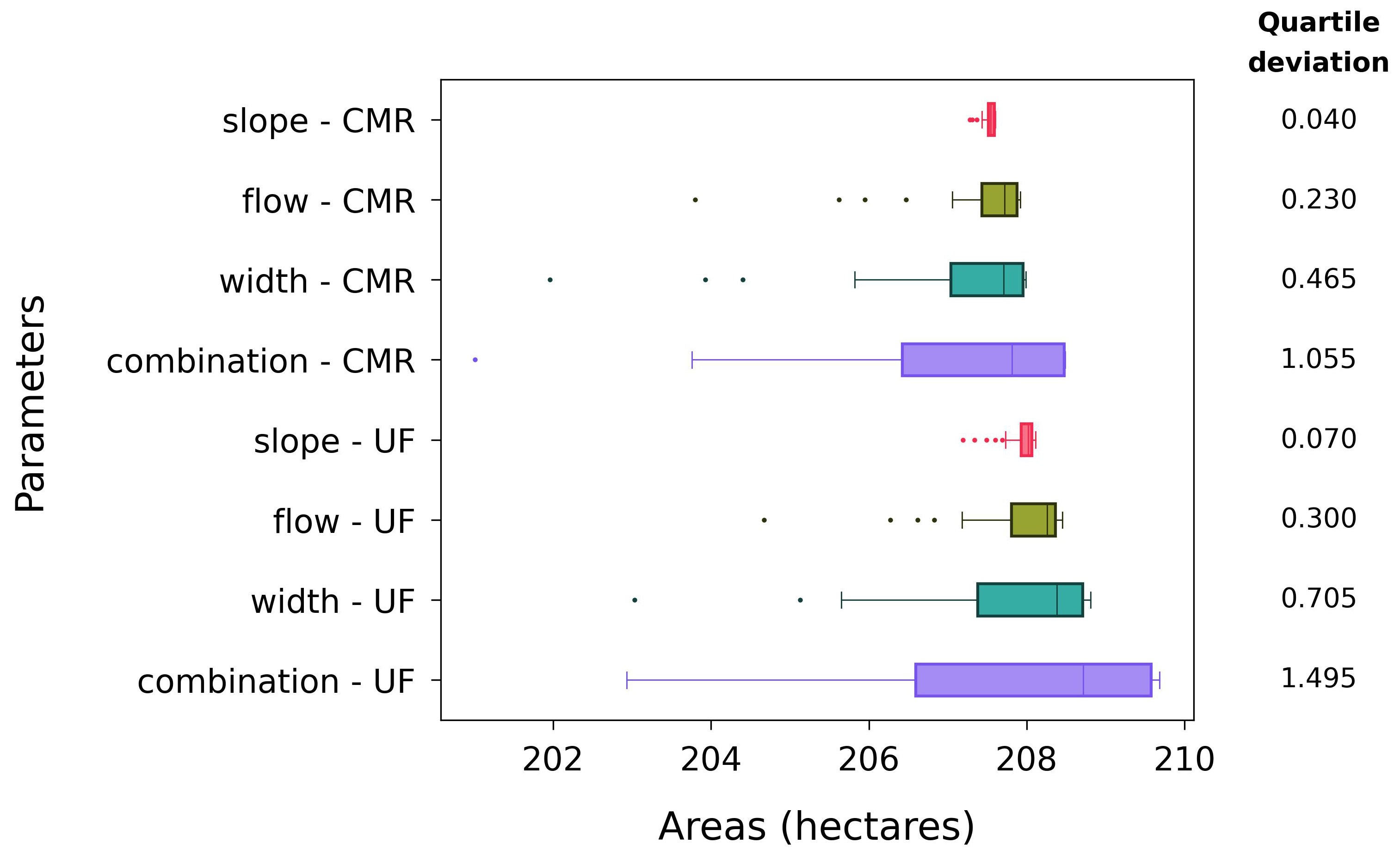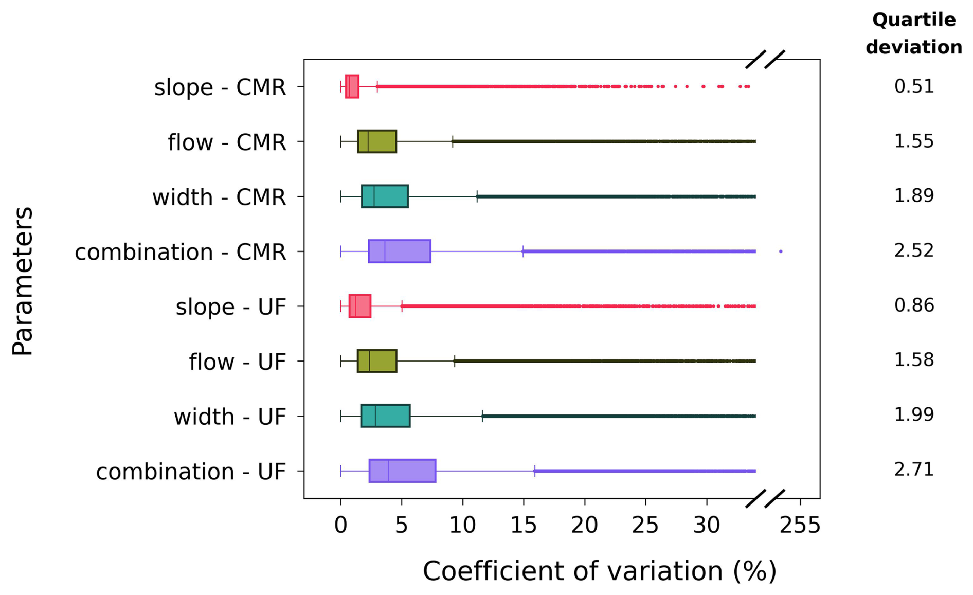 The variations in covMWDs using the eight datasets are presented in Fig. 7 with their quartile deviations for comparison. We observed that, in both formulas, the slope dataset exhibits the smallest variability in the covMWDs, followed by the flow, width, and combination datasets. Furthermore, across all parameters, the UF-formula datasets have higher variability in the covMWDs than the CMR-formula datasets.