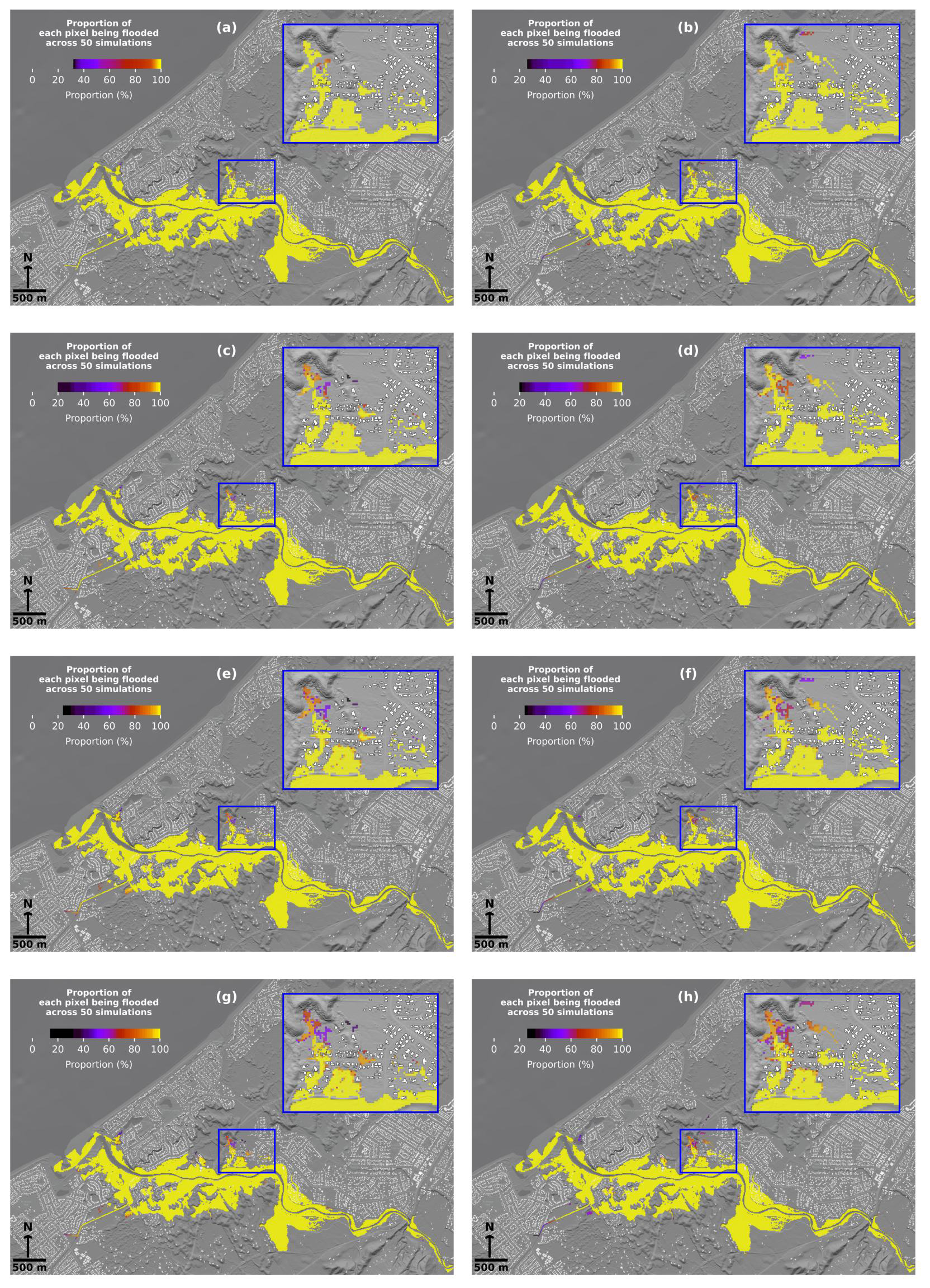 Figure 10Variations in January 2005 flood extents based on simulated Waikanae River bathymetries estimated by parameters with associated error distributions: the Conceptual Multivariate Regression formula – (a) slope, (c) bank-full flow, (e) width, and (g) combined; the Uniform Flow formula – (b) slope, (d) bank-full flow, (f) width, and (h) combined.