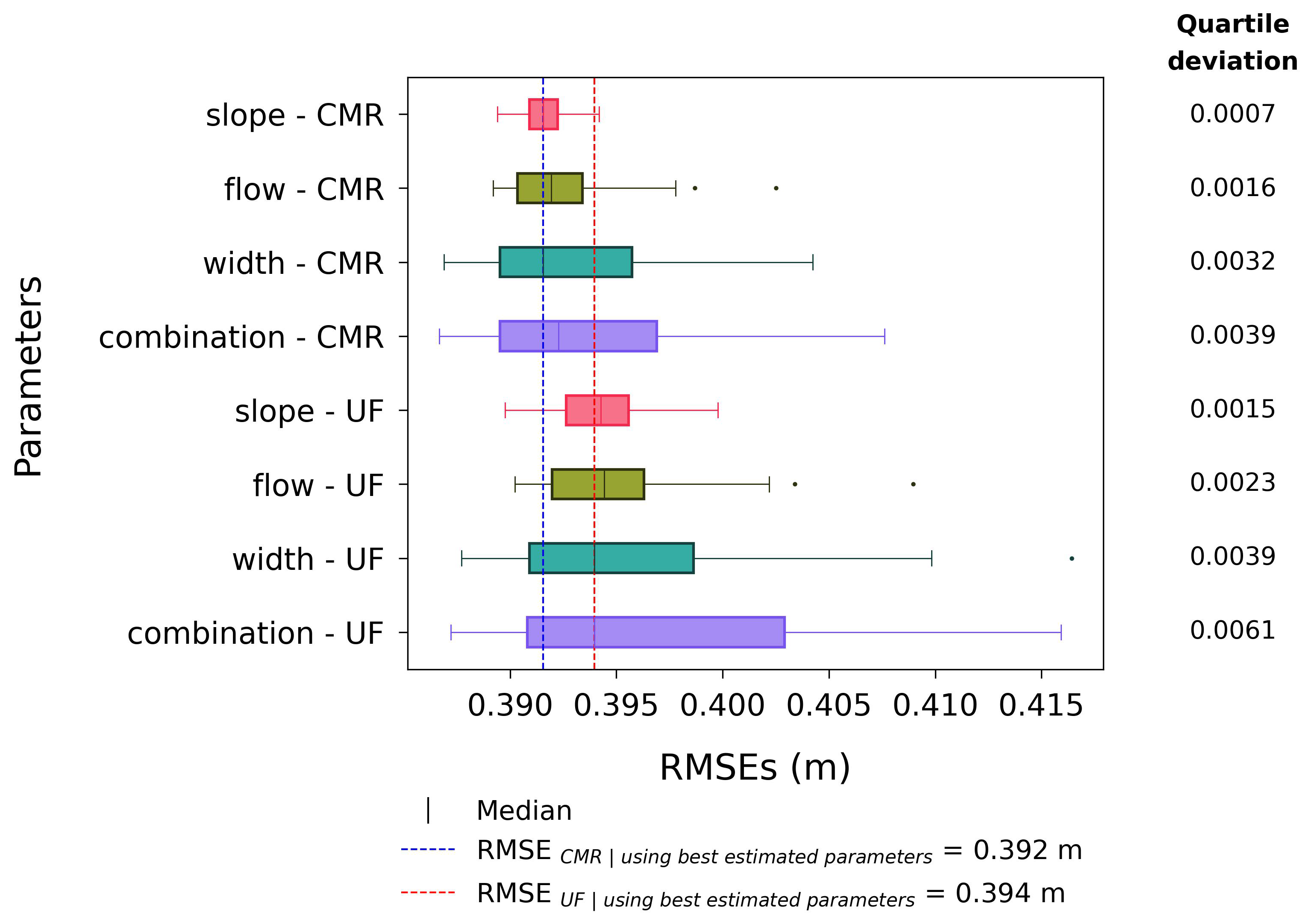 Figure 11 shows that, in both formulas, the variation in RMSEs of the slope dataset is the smallest, followed by those of flow, width, and combination datasets. In addition, the variations in RMSEs of the UF-formula datasets are larger than the CMR-formula datasets. These trends correspond to the order of variations in river bathymetries as mentioned in Sect. 3.1 and 3.2.