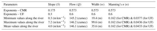 Between two formulas, in the upstream reach of Fig. 5b, e, h, and j, the river bathymetries estimated by the UF are lower than the CMR formula mainly due to the difference in the friction and its exponent, as explained in Sect. 3.1. However, in the downstream reach, both formulas generate shallower rivers in which the UF bathymetries are greater than the CMR bathymetries. This is where the river slope decreases 80 % from about 0.001 to about 0.0002 m m−1. Simultaneously, its width increases up to 400 % from approximately 20 to around 100 m.