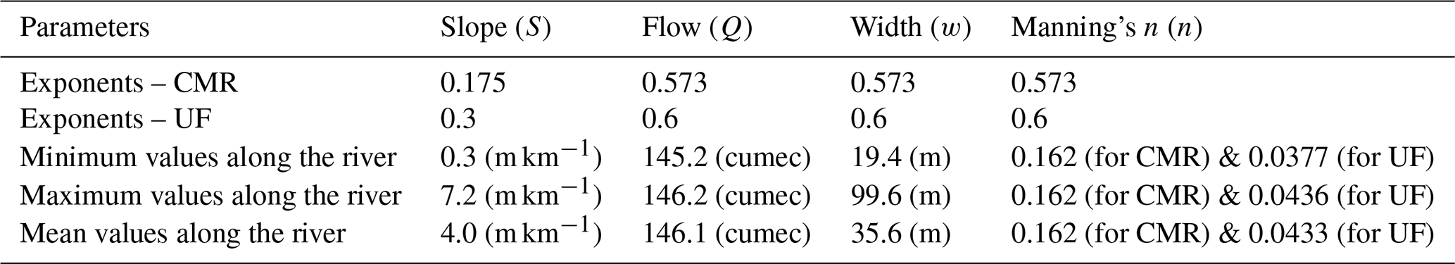 Hence, the exponents of the slope (S), bankfull flow (Q), and width (w) for the CMR formula are 0.175, 0.573, and 0.573.