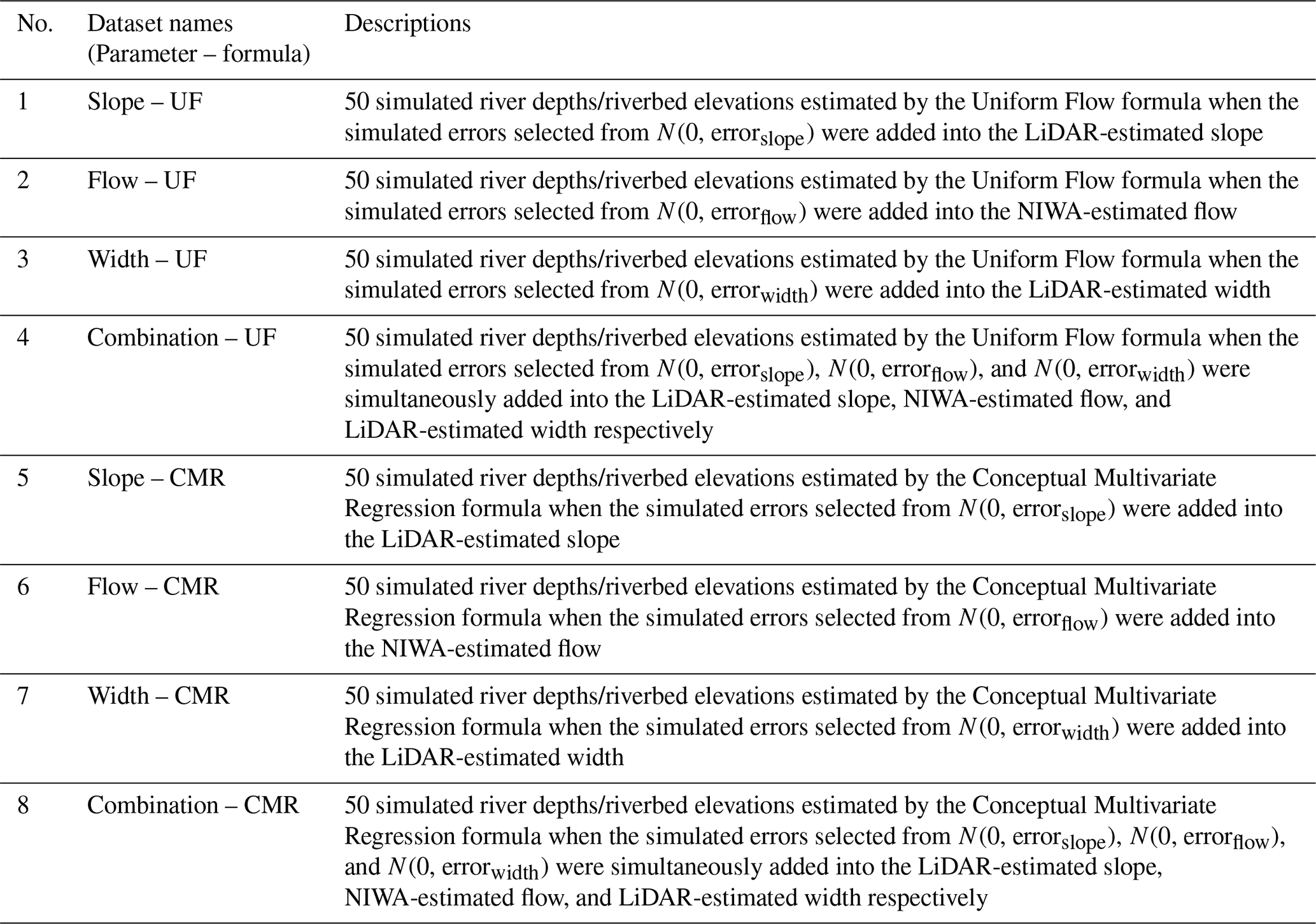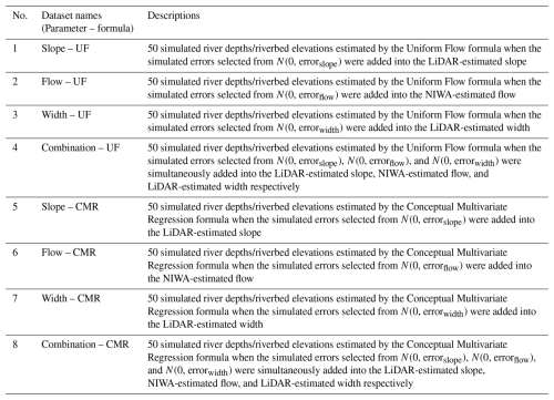 Table 2Dataset descriptions of simulated river bathymetries estimated by the Uniform Flow and Conceptual Multivariate Regression formulas with errors in parameters: river slope, bank-full flow, and width.