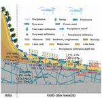 To convey our evolving understanding of the spatial structure and dynamics in the Gully Region, we developed a conceptual model that traces precipitation's transformation into subsurface water, from runoff capture and surface ponding in dammed gully reaches, through infiltration in the unsaturated zone, to recharge in both shallow porous aquifer and deeper bedrock fissure systems (Fig. 11). This conceptual reframing is grounded in the stark contrasts between hydrological processes active on hilly uplands and managed gully systems. In the hilly uplands, previous studies have shown that thick loess deposits, often exceeding 90 m (including low-permeability aquifers), combined with steep slopes (>15°) severely restrict vertical infiltration (Zhu et al., 2018; Huang et al., 2019; Huang et al., 2024). Compounded by short-duration, high-intensity rainfall events that provide insufficient moisture for deep profile wetting, rainfall is converted rapidly into surface runoff (Li et al., 2021). Our new work shows that runoff is systematically funneled downslope into gully systems as a consequence of ecological engineered check dams and retention ponds that intercept and concentrate overland flow. Most infiltration occurs after surface water accumulates in fill zones of engineered gullies. Ponds and perched water bodies subsequently serve as localized recharge foci.