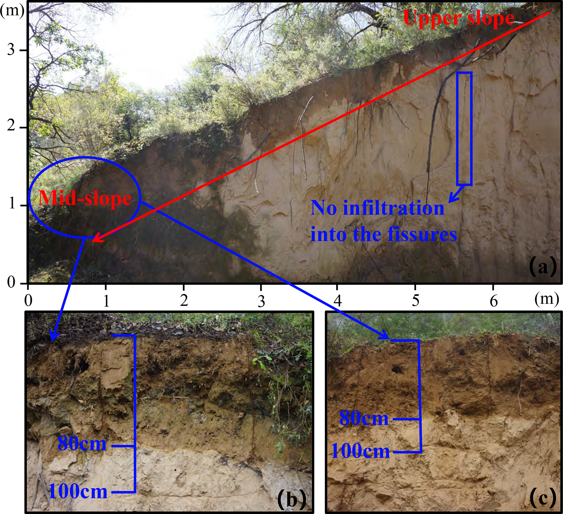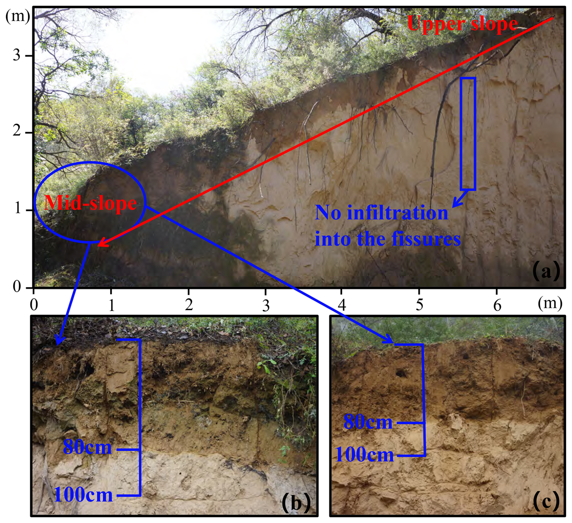 Figure 2The topographic profile of the Nianzhuang Catchment in the hilly region of the Loess Plateau. Full profile from the top to mid-slope (a); two repeated mid-slope profiles (b, c). The photo was taken after a 41 mm rainfall event over 4 d. Subsequent measurements showed that infiltration depths reached only 20–30 cm at the top of the slope, compared to approximately 80 cm at the mid-slope positions.