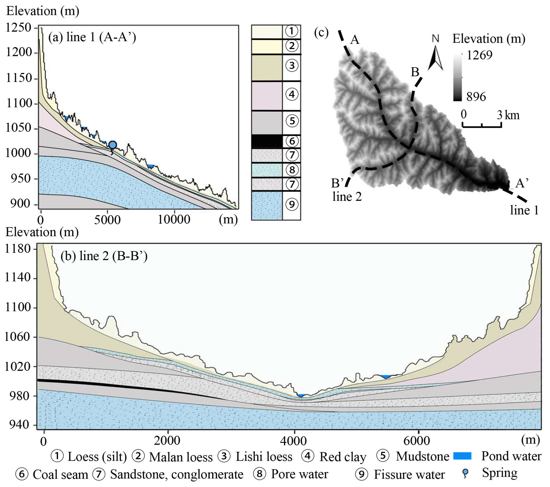 Figure 3Hydrogeologic cross-section of the study area. Cross-section along Line 1 (Northwest–Southeast) (a); cross-section along Line 2 (Southwest–Northeast) (b); location map of Line 1 and Line 2 within the study area (c). The Malan Loess (11.7–12.6 Ka BP) and Lishi Loess (12.6–78.1 Ka BP) are two major Quaternary loess stratigraphic units in China. Based on hydrogeological research, the stratigraphy of the hilly region features a multi-layer structure from top to bottom: Upper Pleistocene Malan Loess, Middle Pleistocene Lishi Loess, Neogene Red Clay and Mudstone (2.58–23.03 Ma BP), and Jurassic Sandstone and Conglomerate (145–201.3 Ma BP). In the gully region, the stratigraphy includes Holocene loess (silt, 11.7 ka BP–present), Middle Pleistocene Lishi Loess, Neogene sandstone and mudstone, and Jurassic sandstone and conglomerate, with some areas containing coal seams up to 5 m thick.