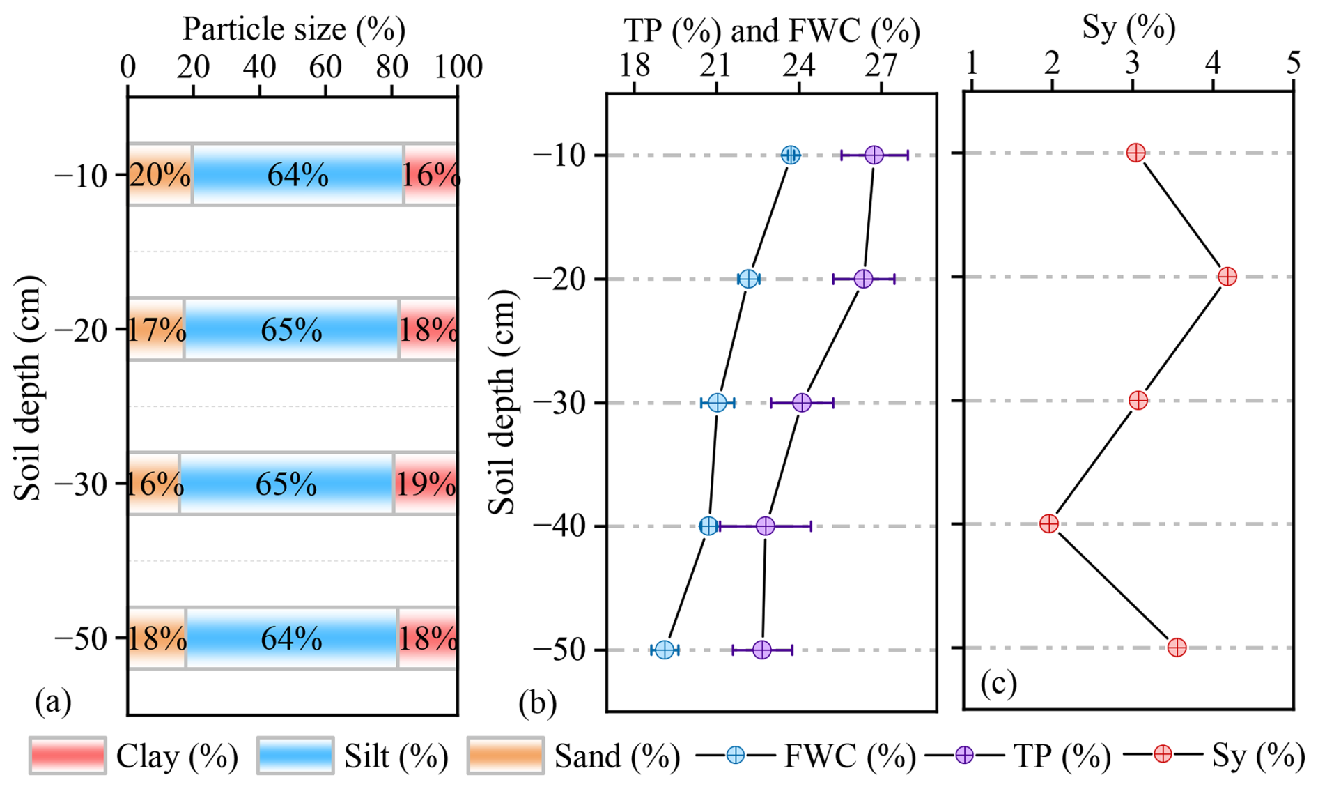 Figure 4Vertical variation in soil texture and water retention characteristics in the gully region of the Loess Plateau. (a) Soil particle size distribution by depth, showing relatively uniform composition across layers (10–50 cm), dominated by silt (64 %–65 %), with moderate clay (16 %–20 %) and low sand (16 %–20 %) content. This fine-textured profile supports high moisture retention and slows infiltration, promoting delayed recharge. (b) Depth profiles of total porosity (TP) and field water capacity (FWC) reveal decreases with depth to 40 cm, with FWC reaching ∼27 %, suggesting greater water-holding capacity in subsoil layers and enhanced buffering of infiltrated water. (c) Vertical variations in the Specific Yield (Sy) across different soil layers. Collectively, these physical properties reflect a vertically stratified soil system where near-surface layers regulate infiltration pulses, and deeper layers act as long-term storage, shaping the timing and magnitude of subsurface recharge.