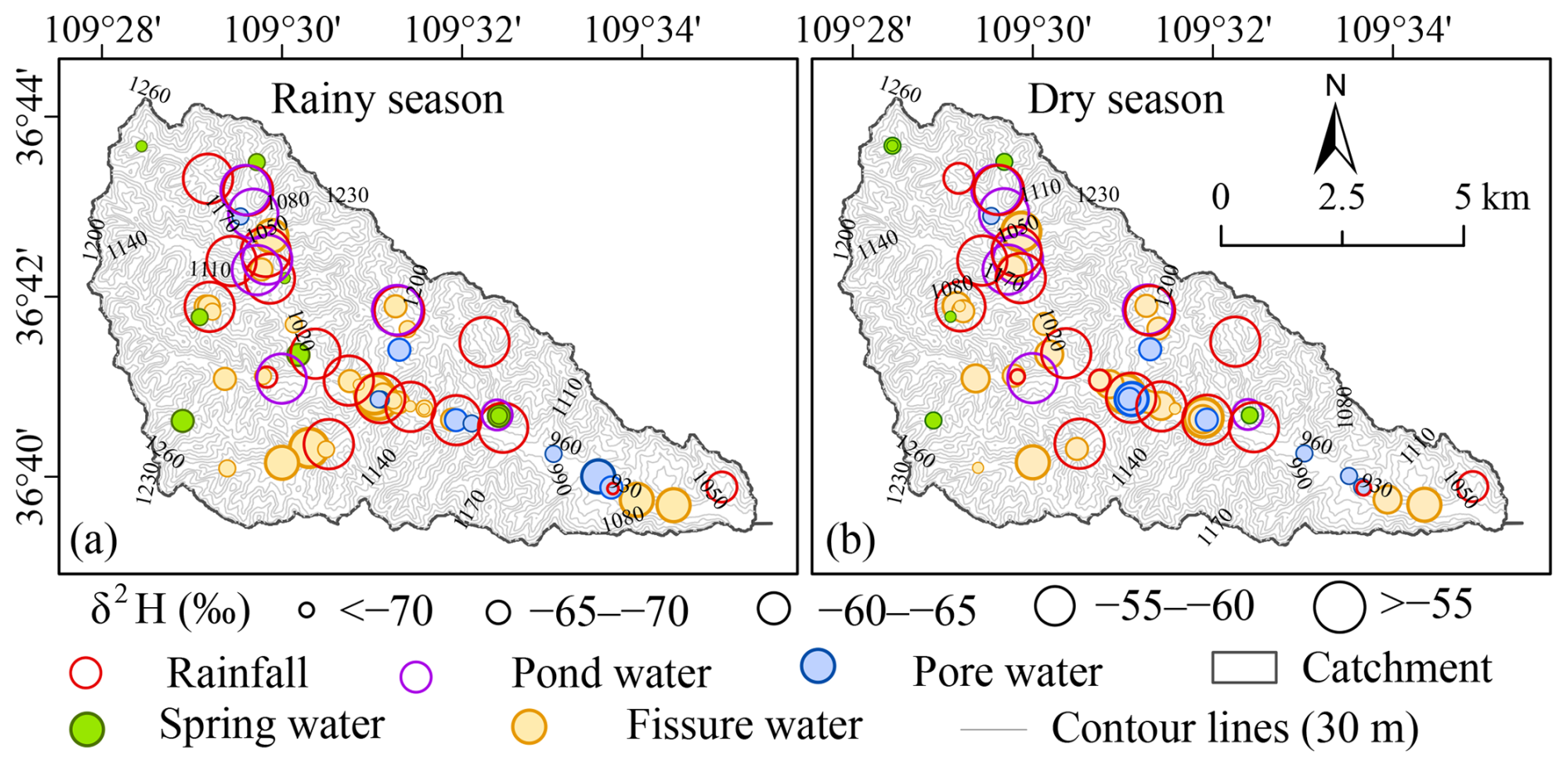 Figure 5The spatial distributions of δ2H values during the (a) rainy season and (b) dry season for rainfall, pond water, spring, pore water, and fissure water in the gully region of the Loess Plateau. To highlight spatial differences among water sources, δ2H values were classified into five intervals: ‰, −70 ‰ to −65 ‰, −65 ‰ to −60 ‰, −60 ‰ to −55 ‰, and ‰. Sampling points are color-coded by water type: red for rainfall, purple for pond water, blue for pore water, green for spring water, and orange for fissure water.