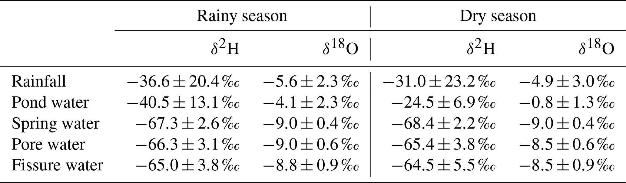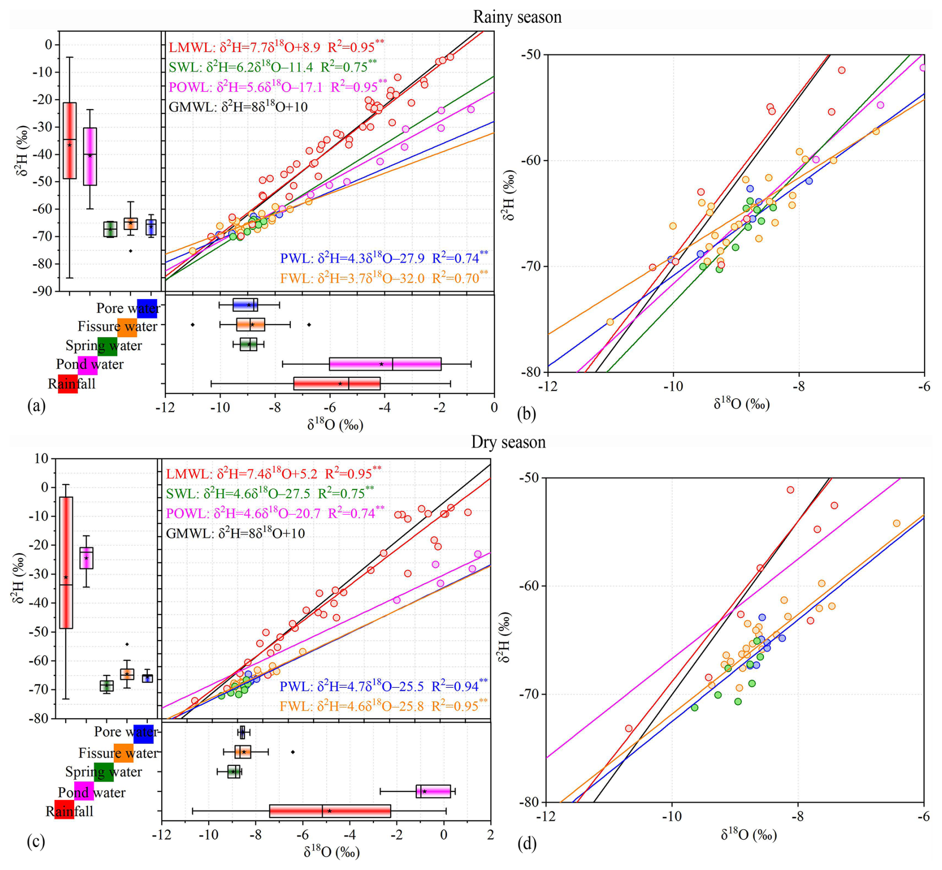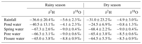 Pore and fissure water show remarkably similar isotopic signatures during the rainy season. Pore water, again sampled from a porous subsurface aquifer, follows a fitted line of δ2H = (rainy season; R2=0.74), while fissure water, likely drawing from the same aquifer but through weathered bedrock pathways, fits δ2H = (rainy season; R2=0.70). These slopes are significantly flatter than those of rainfall, pond, or spring water, a pattern interpreted as evidence of evaporation prior to recharge or mixing with evaporated surface water. However, the box plots of the isotope data present a different picture. Both pore and fissure waters are systematically more depleted in δ18O and δ2H than precipitation, and their narrow interquartile ranges suggest a relatively uniform isotopic composition (Fig. 6a–d).