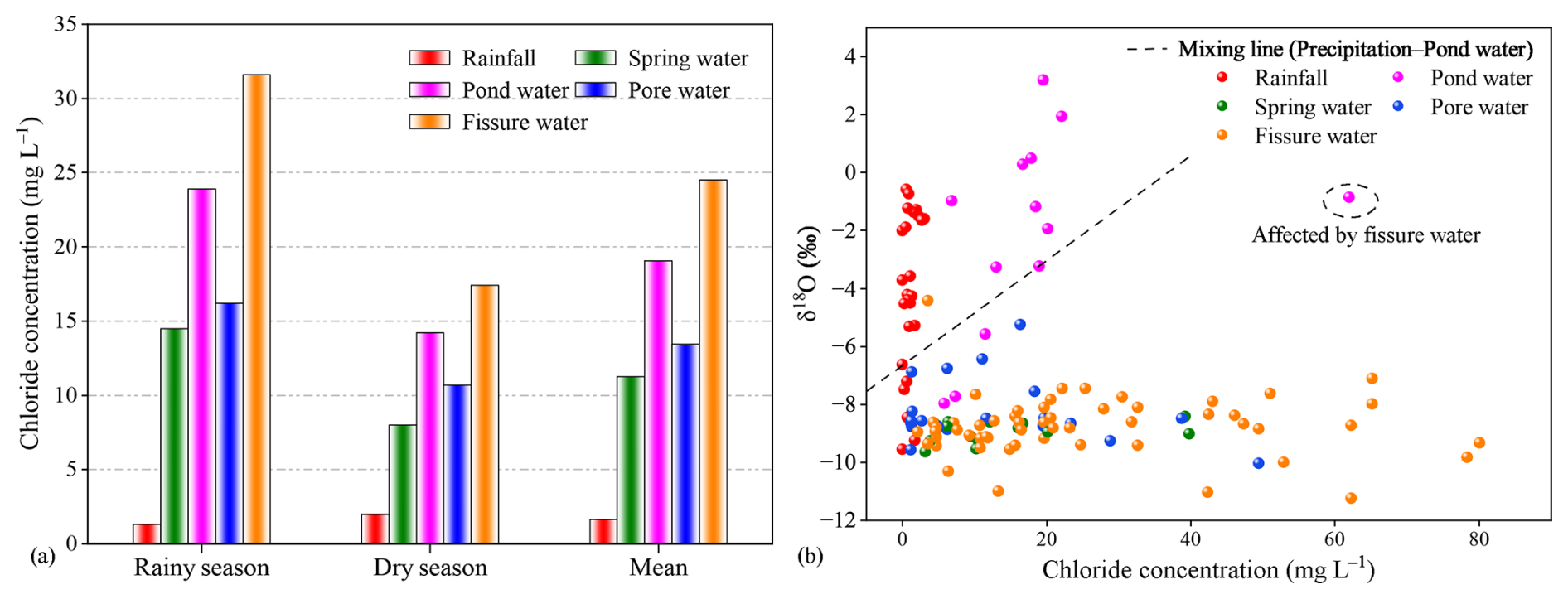 Figure 7Chloride concentration of various water sources in the rainy and dry seasons (a), and the spatial relationship between chloride concentration and δ18O for different water sources (b).