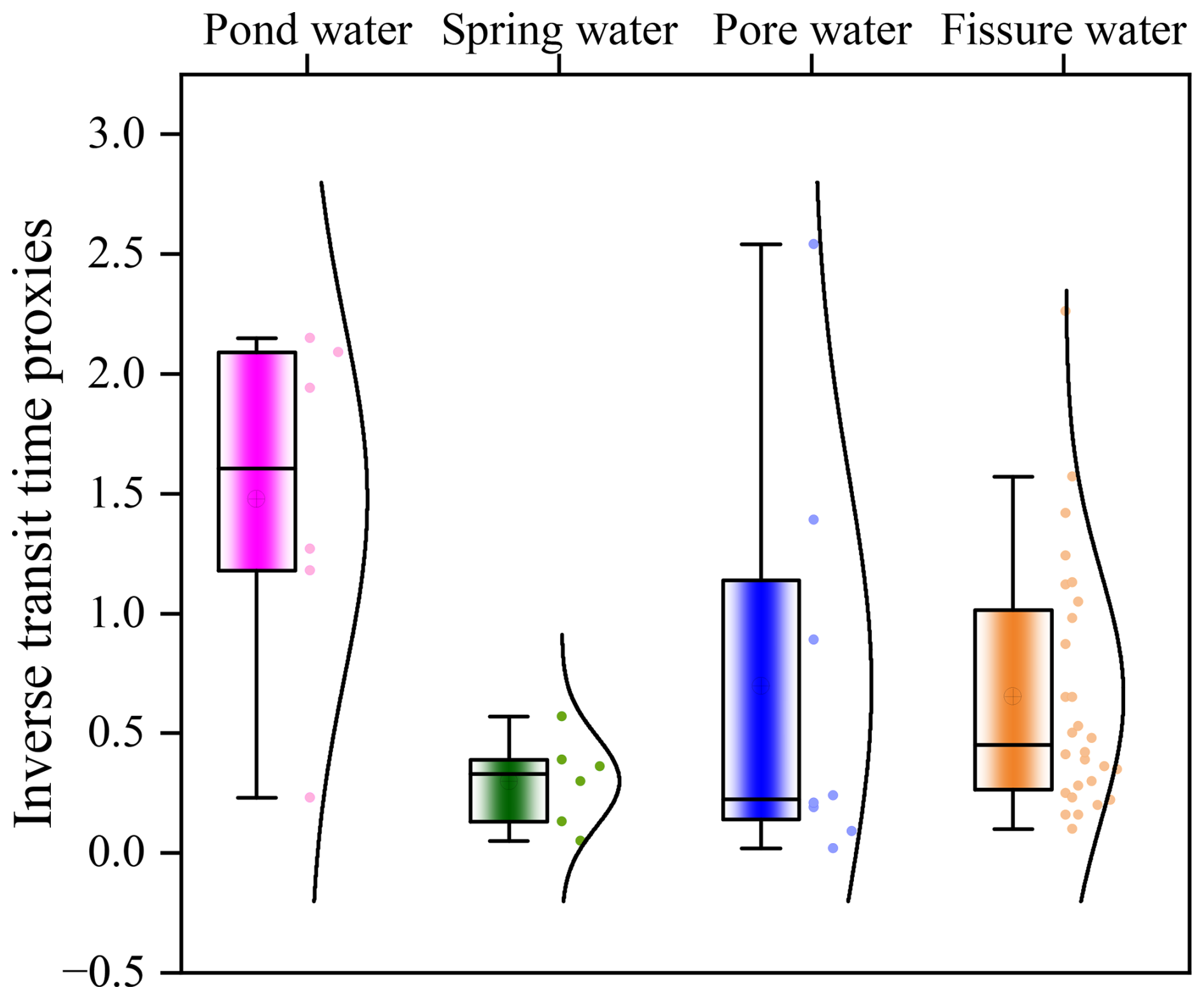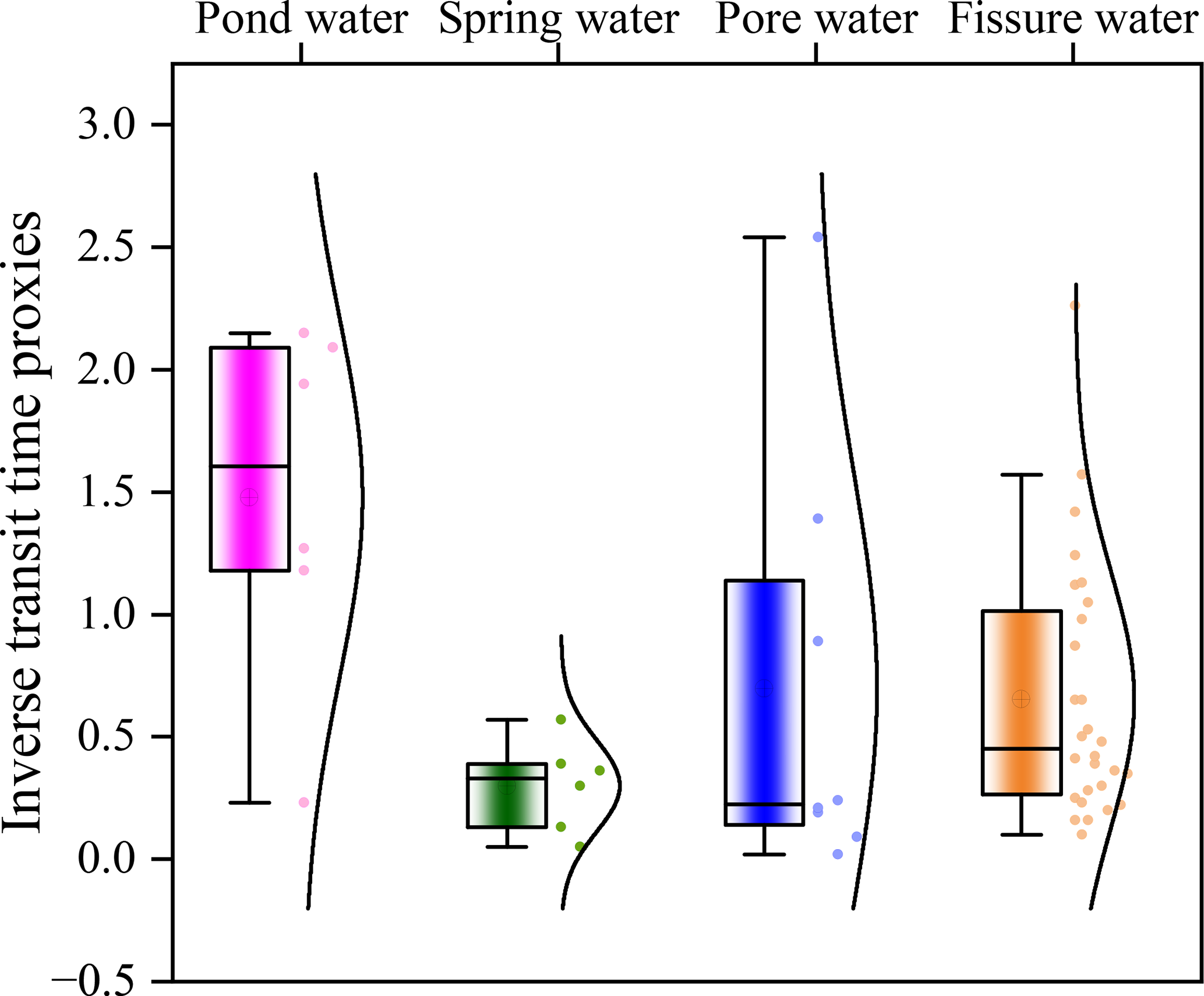 Figure 8Boxplots and kernel density estimates of inverse transit time proxies (ITTPs) for pond water, spring water, pore water, and fissure water. Higher ITTP values indicate shorter water transit times since precipitation, while lower values suggest longer residence and greater isotopic damping. Pond water exhibited the highest and most consistent ITTPs (median ≈1.5), implying rapid recharge from recent rainfall or stormflow. Spring water showed the lowest ITTPs (≈0.3), consistent with longer subsurface flow paths and storage. Pore and fissure water displayed intermediate and more variable ITTPs, reflecting mixing between recent and older water sources, as well as seasonal differences in infiltration and soil moisture replenishment.