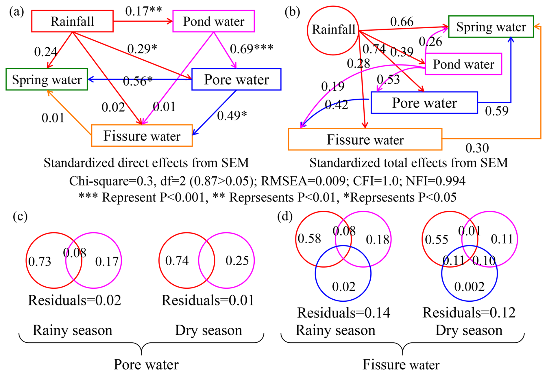Figure 9Structural equation modeling (SEM) and variance partitioning results illustrating hydraulic connectivity among water sources in the gully region of the Loess Plateau. Panels (a) and (b) show the standardized direct (a) and total effects (b) among rainfall, pond water, pore water, spring water, and fissure water, based on δ18O and δ2H data. In SEM, the total effect includes both direct pathways (a; e.g., rainfall → pore water) and indirect pathways mediated by other variables (b; e.g., rainfall → pond water → pore water). Arrows indicate hypothesized water flow pathways, with line thickness proportional to effect size. Asterisks denote statistical significance (* P<0.05, ** P<0.01, *** P<0.001). The model fit is excellent (χ2=0.3, df = 2, RMSEA = 0.009, CFI = 1.0, NFI = 0.994), supporting the robustness of these inferred connections. Panels (c) and (d) present variance partitioning results showing the relative contributions of source waters to pore water and fissure water during the rainy and dry seasons, respectively. In panel (c), rainfall (red) and pond water (pink) explain a large portion of pore water variability, with some shared explanatory power and modest residuals. In panel (d), fissure water reflects a more complex origin, with contributions from rainfall (red), pond water (pink), and pore water (blue), and greater overlap and residuals, especially during the dry season.