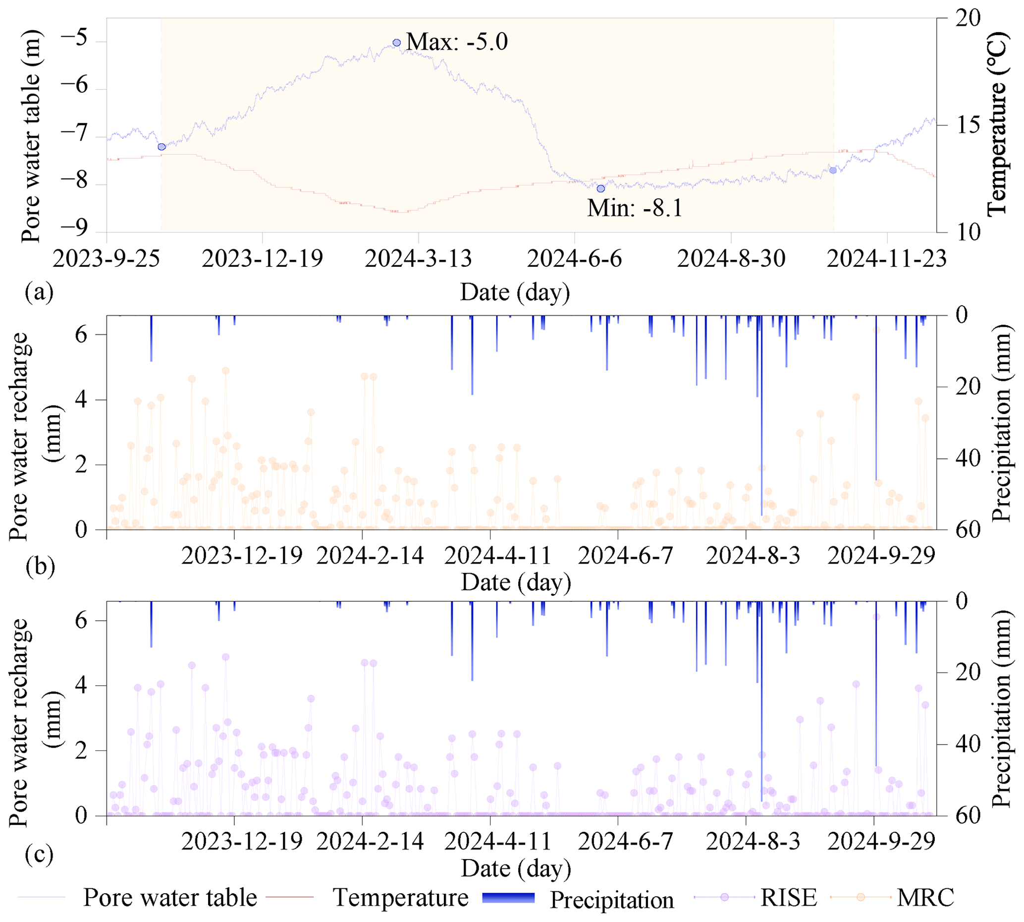 Figure 10Temporal dynamics of pore water table depth, temperature, precipitation, and recharge in the gully region of the Loess Plateau. (a) Daily time series of pore water table depth (blue line) and surface temperature (red line) from September 2023 to November 2024. The water table fluctuates seasonally, rising from m in late summer to a maximum of m in early spring (March 2024), indicating delayed infiltration and cool-season recharge. (b) Daily precipitation (blue bars) and modeled pore water recharge estimates using the MRC methods. (c) Daily precipitation (blue bars) and modeled pore water recharge estimates using the RISE methods. Most recharge events occur from October to April, even when rainfall is not especially high, while warm-season precipitation contributes little to recharge, likely due to increased evaporative losses and shallow soil retention. Together, these patterns suggest strong seasonal control on recharge processes, with effective infiltration primarily occurring during cooler, low-evaporation periods.
