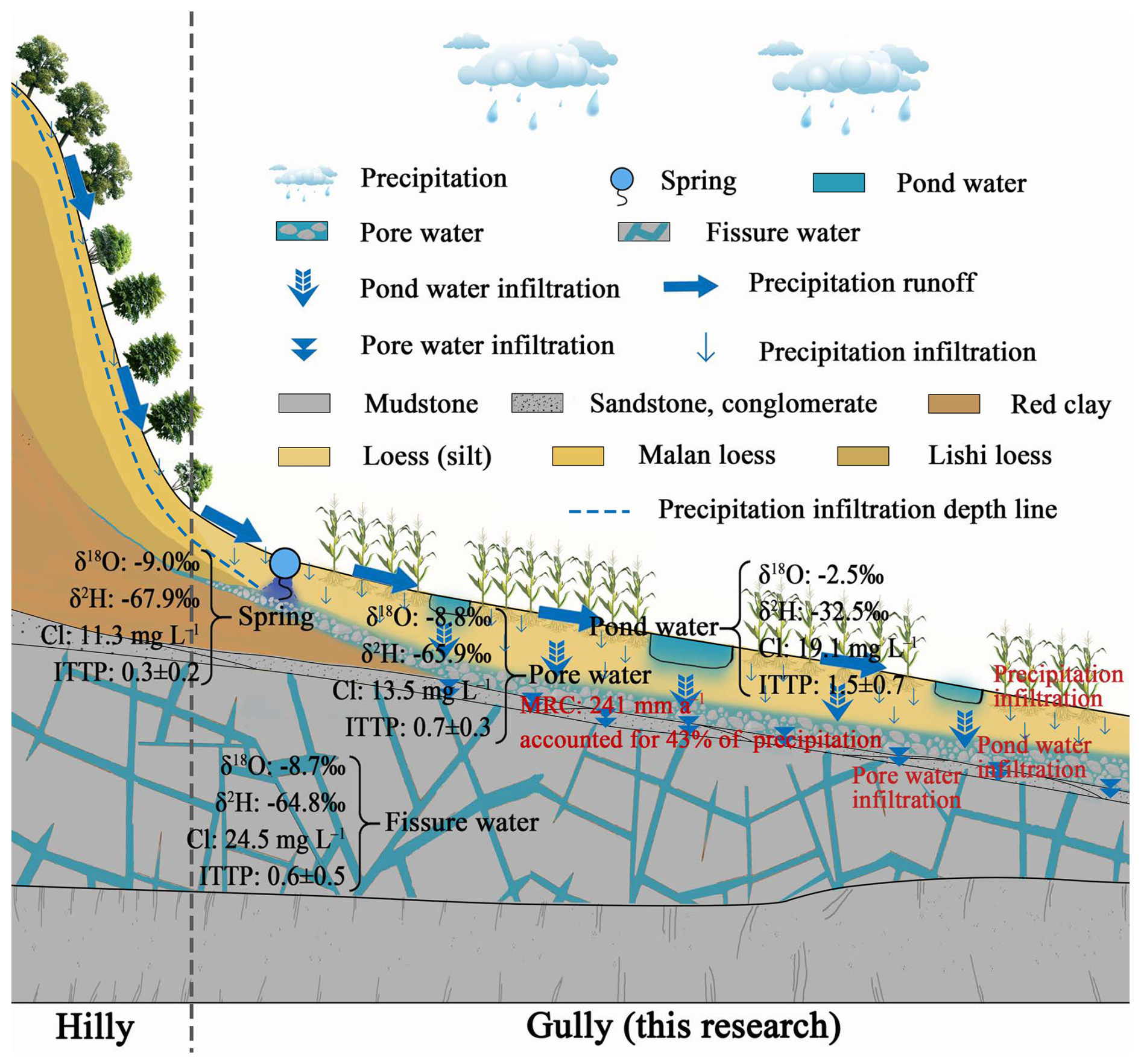 Crucially, gully systems possess distinct hydrogeological characteristics: the loess mantle is much thinner (typically <25 m), and the soils are dominated by silt loam textures with moderate specific yield (0.02–0.05) and high field capacity (21 %–28 %). These properties promote transient water storage and enable temporally delayed and depth-partitioned infiltration. Based on our integrated analyses of stable isotopes, chloride concentrations, and inverse transit time proxies, we find that engineered gullies function not as passive erosional features but as active, managed recharge conduits. This conceptualization captures a critical spatial transition, from runoff generation in the hilly uplands to focused recharge in gully zones, emphasizing the pivotal role of gully systems in regulating groundwater recharge across the Loess Plateau landscape.