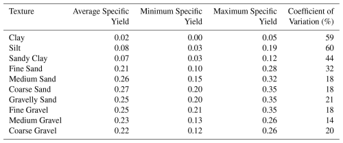 Shah, N. and Ross, M.: Variability in specific yield under shallow water table conditions, J. Hydrol. Eng., 14, 1290–1298, https://doi.org/10.1061/(ASCE)HE.1943-5584.0000121, 2009.