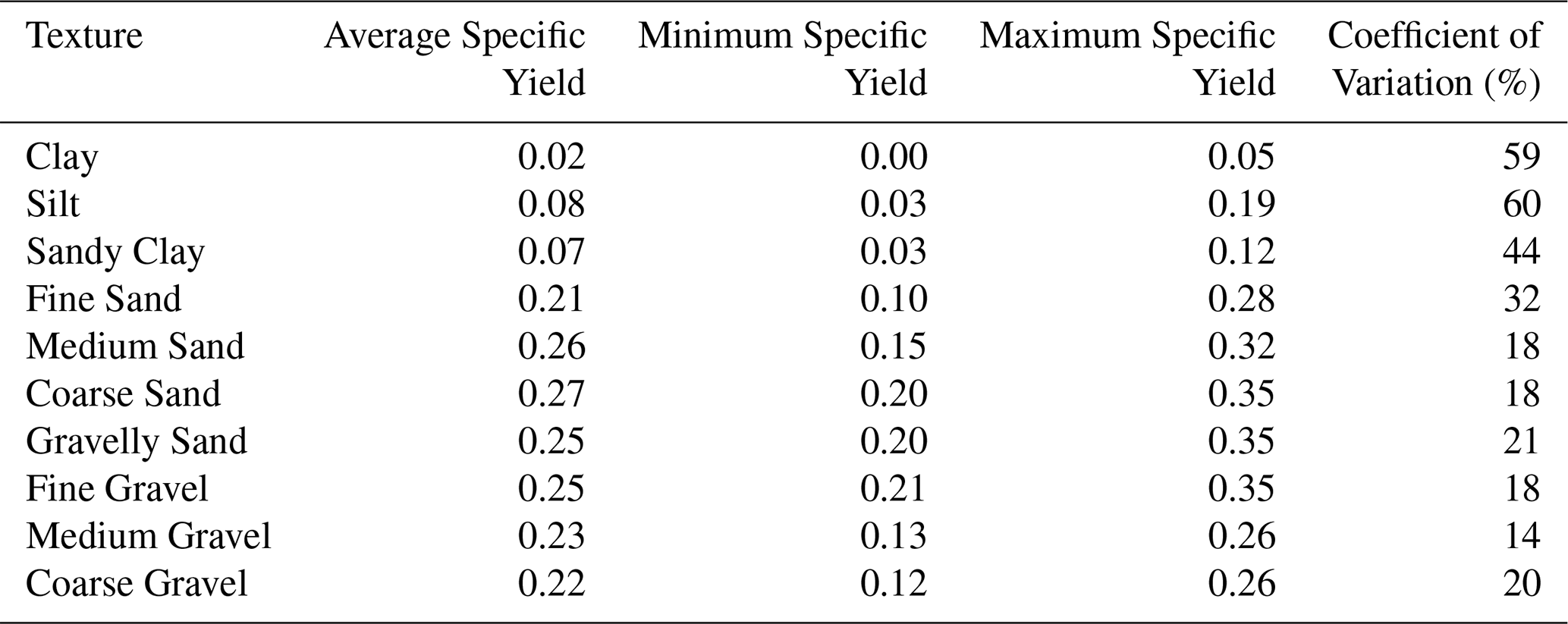 Empirical values for soil texture are referenced in Table A1. The test pit method for estimating Sy is described as follows: