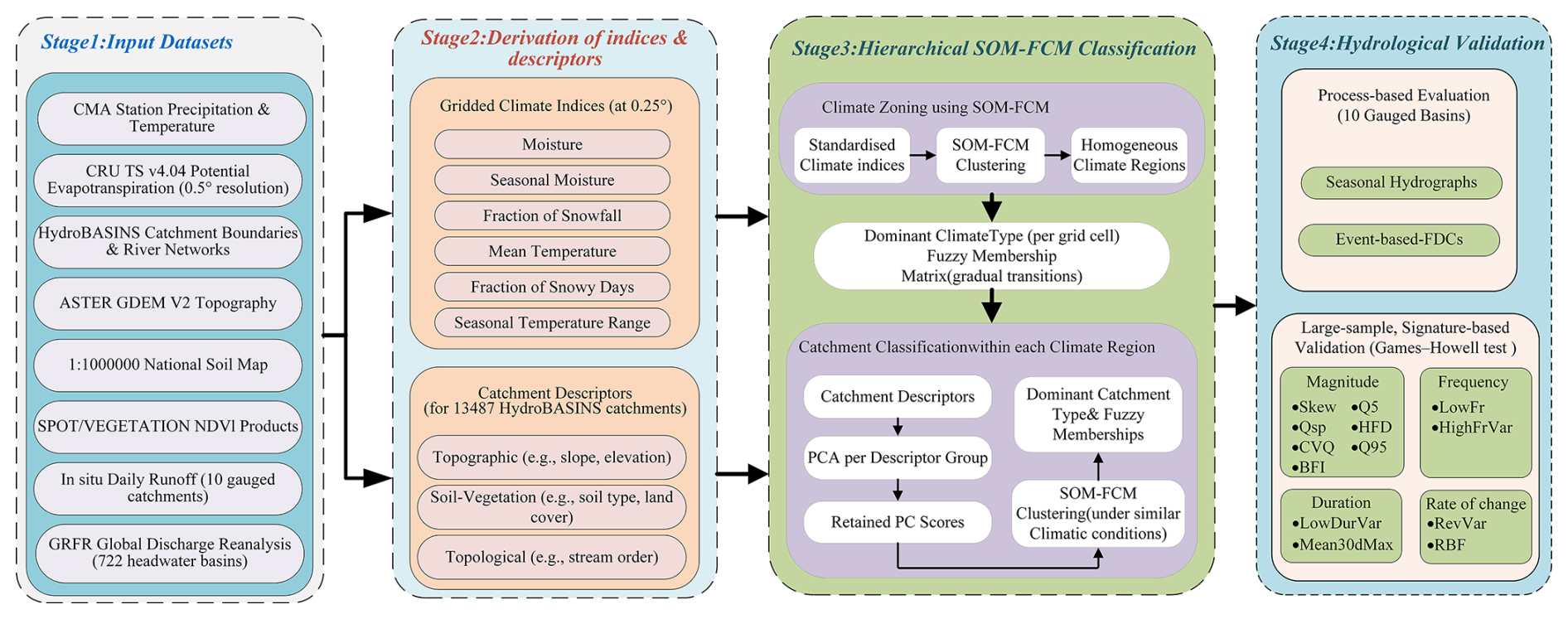 The objectives of this paper are to (i) construct a hierarchical national framework for catchment similarity in China by integrating SOM-FCM; (ii) derive climate regions and within region catchment types based on hydroclimatic and geomorphological similarity; and (iii) evaluate the hydrological relevance of the resulting groups across time scales using both gauge records and reanalysis flow signatures. The remainder of this paper is organised as follows. Section 2 describes the datasets, indices and descriptors, and the hierarchical SOM-FCM methodology. Section 3 presents the derived climate regions and catchment classes and summarises validation results. Section 4 discusses implications for regionalisation in China and limitations of the proposed framework. Section 5 concludes the paper.