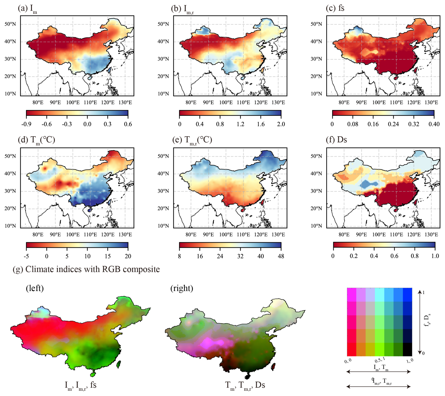 Figure 2 shows pronounced spatial gradients in the six climate indices across China. At the large scale, patterns are mainly organised by latitude and elevation, whereas major mountain ranges (e.g. the Tianshan and Himalayan Mountains) introduce sharp local transitions. All indices were standardised to the range 0–1 and visualised using two ternary RGB composites: one for the moisture-related indices (Im, Im,r, and fs) and one for the temperature-related indices (Tm, Tm,r, and Ds) (Fig. 2g). These composites highlight coherent spatial structures and relationships among the indices. The moisture composite displays a clear northwest-southeast gradient in Im, Im,r, and fs, reflecting a progressive increase in wetness from arid to humid regions (Fig. 2g, left). Arid regions (red tones) occupy northwestern China and are characterised by extensive deserts, high potential evapotranspiration relative to precipitation, negligible seasonality in humidity, and virtually no snowfall. Humid regions (dark green) are concentrated along the middle and lower reaches of the Yangtze River and exhibit little snowfall, weak seasonality and abundant rainfall throughout the year. Transitional climate regions (bright green and yellow) lie between these extremes and show a strongly seasonal water-energy balance, most notably in the seasonal variation of precipitation and potential evapotranspiration. Areas where most precipitation falls as snow are highlighted by pink colours.