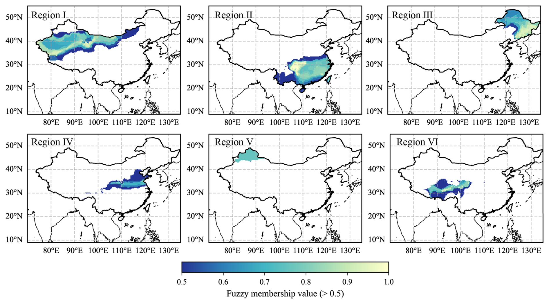 When projected back into geographic space, the six SOM-FCM clusters correspond to major climate regions across China (Fig. 4). In the climate feature space, the cluster centroids are separated along moisture, temperature, and snow-related gradients (Fig. S1). Region I covers much of the north-western desert belt and is extremely arid, with very low moisture indices, almost no snowfall and only modest seasonality in temperature. Region II occupies the middle and lower reaches of the Yangtze River in south-eastern China and exhibits a warm, humid monsoon climate with high temperatures and weak intra-annual variability in humidity and temperature. Region III spans the Northeast China Plain and is cold and snow-influenced, with low mean temperatures, frequent snowfall and strong seasonality in both temperature and precipitation. Region IV, covering much of the North China Plain and the middle and lower Yellow River basin, is warmer and more seasonal than Region III, showing higher temperatures and more pronounced variability in the moisture indices. Region V comprises the foreland basins north of the Tianshan Mountains and is characterised by a high fraction of snowfall and marked seasonal contrasts in both temperature and moisture. Region VI corresponds to the Tibetan Platea; like Region III it is cold and snow-affected, but it features more uniform temperatures and somewhat weaker seasonality. Because the underlying climate fields vary smoothly, boundaries between regions are diffuse and grid cells near the interfaces exhibit mixed memberships. For subsequent catchment classification, each grid cell is therefore assigned to its dominant climate type (maximum membership), while the full fuzzy membership matrix is retained to support the interpretation of transitional areas.