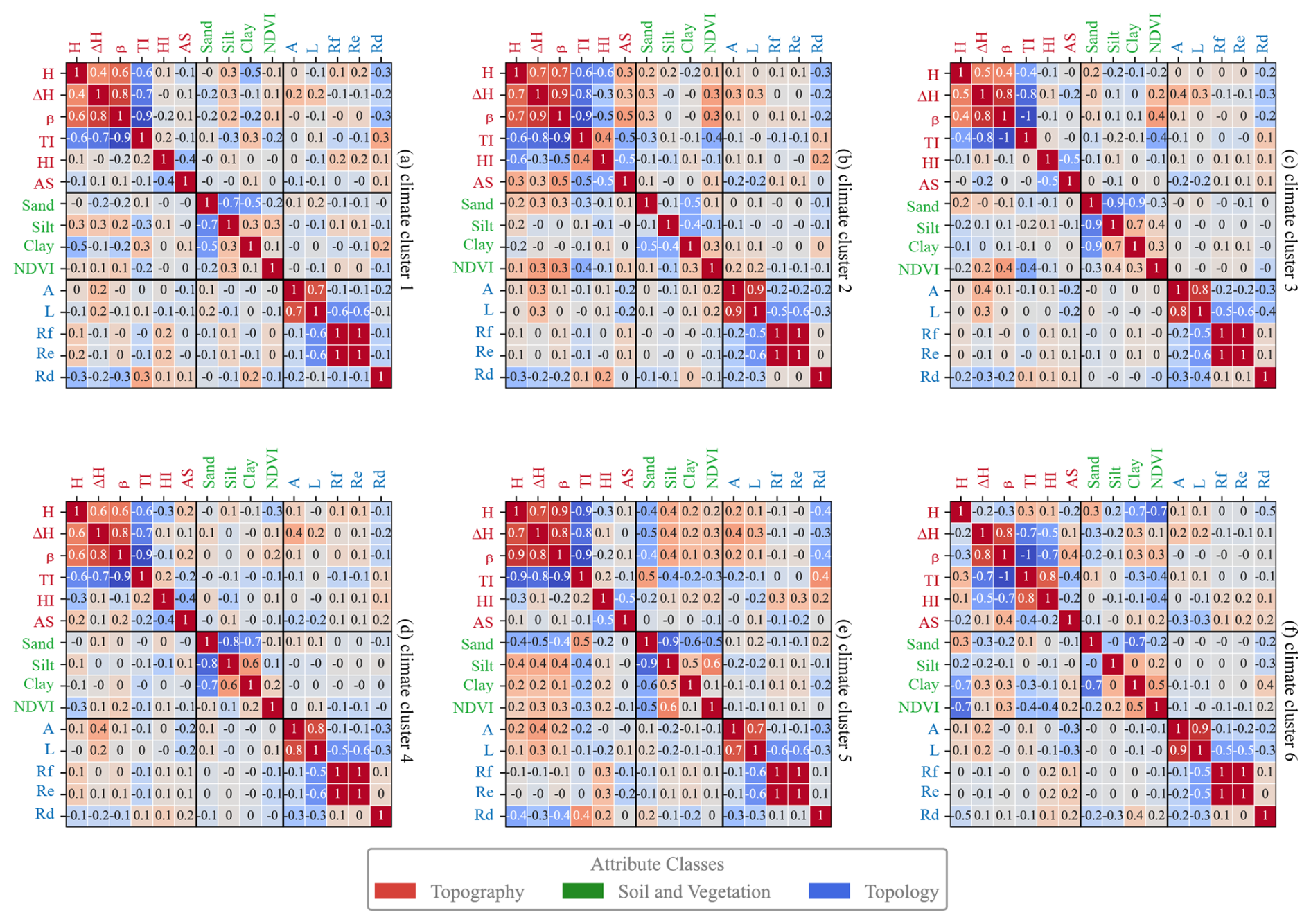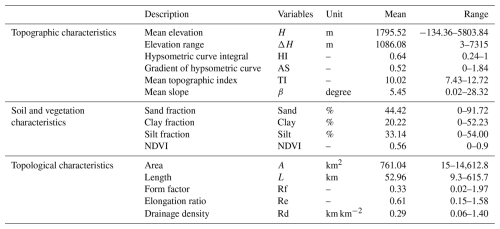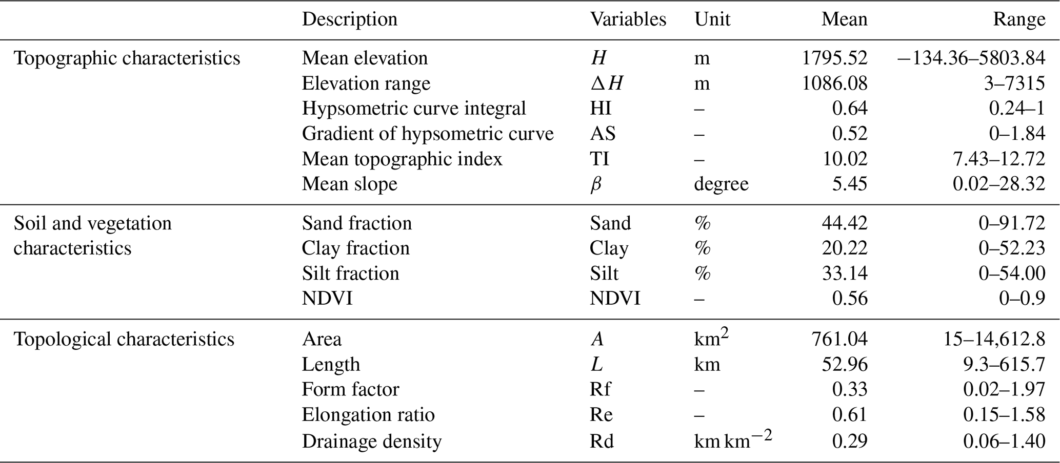 All descriptors were computed for the 13 487 catchments using the DEM, soil, land-cover, and hydrographic datasets introduced in Sect. 2.1. Topographic and drainage-network properties were derived from the digital elevation model and river network, whereas soil texture and vegetation indices were obtained from national soil maps and remote sensing products. This ensures that the selected variables are consistently defined across all basins and can, in principle, be transferred to ungauged regions where similar datasets are available.