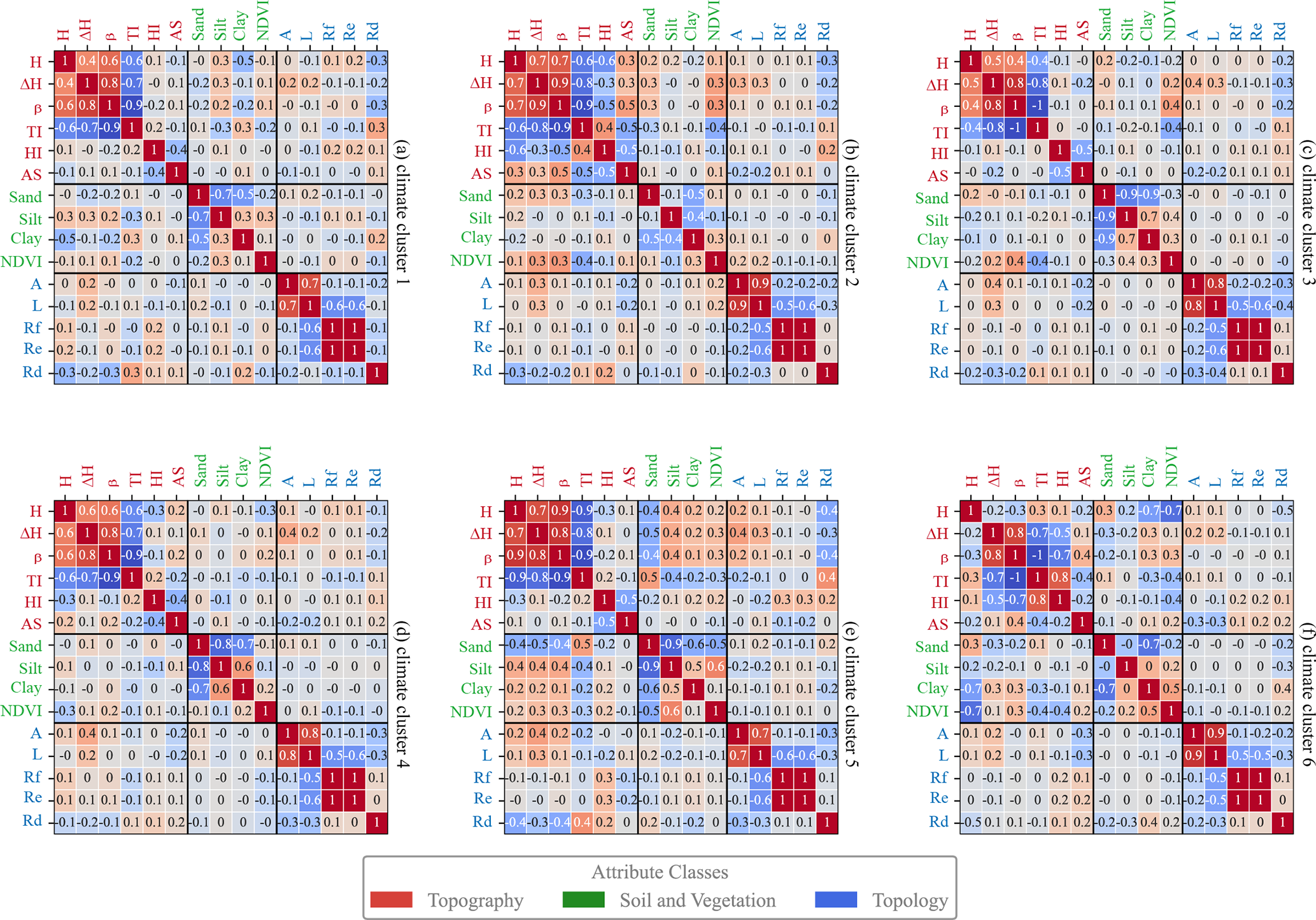 Within each climate region, we first examined how catchment descriptors covary to assess redundancy and to guide dimensionality reduction. Spearman rank correlation were computed for all pairs of descriptors in each climate region, and the resulting regional correlation patterns were compared with the national-scale correlations (Fig. 5). Descriptors belonging to the same class generally showed strong correlations (e.g. β and TI, both topographic characteristics, correlation coefficient > 0.9), whereas descriptors from different classes were only weakly correlated (e.g. β and L , which belong to topographic characteristics and topological characteristics, respectively, with a correlation coefficient < 0.1). Correlation structures were broadly similar across climate regions (Fig. S2), for more than 80 % of descriptor pairs, the difference between regional and national correlation coefficients was <0.4. Some notable regional deviations occurred, particularly for the relationship between NDVI and H. At the national scale, vegetation cover tends to decrease with elevation; but in the high-elevation Tibetan Plateau (Region VI) NDVI and H are positively correlated (correlation coefficient = 0.7), whereas in lowland plains (Regions II and V) the correlation is weak or negative. This pattern reflects the stronger control of elevation on temperature, and hence vegetation growth, in mountainous areas, while in plains temperature varies mainly with latitude. Overall, despite such local differences, the descriptors exhibit broadly comparable correlation structures across climate regions.