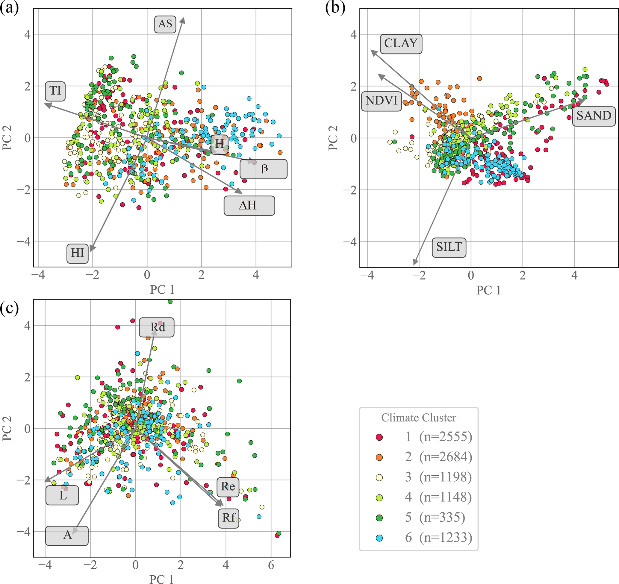Figure 6Biplots of the principal components: (a) topographic characteristics, (b) soil and vegetation, and (c) topological characteristics. Colors represent the climate clusters, while n indicates the number of catchments within each climate region.