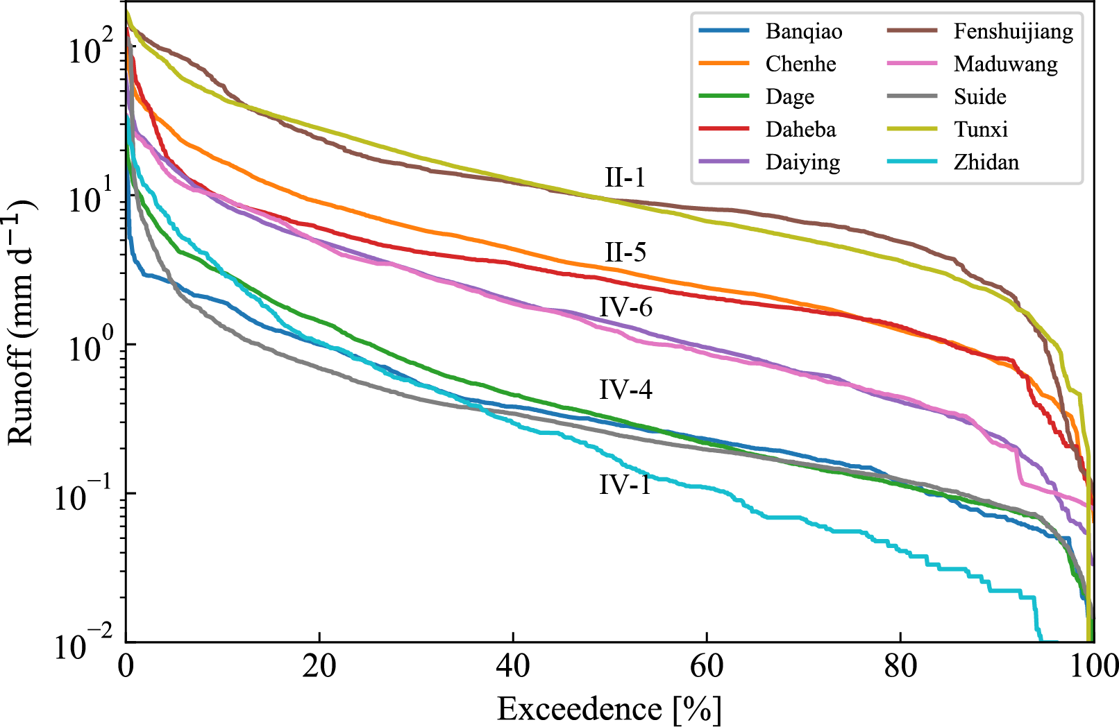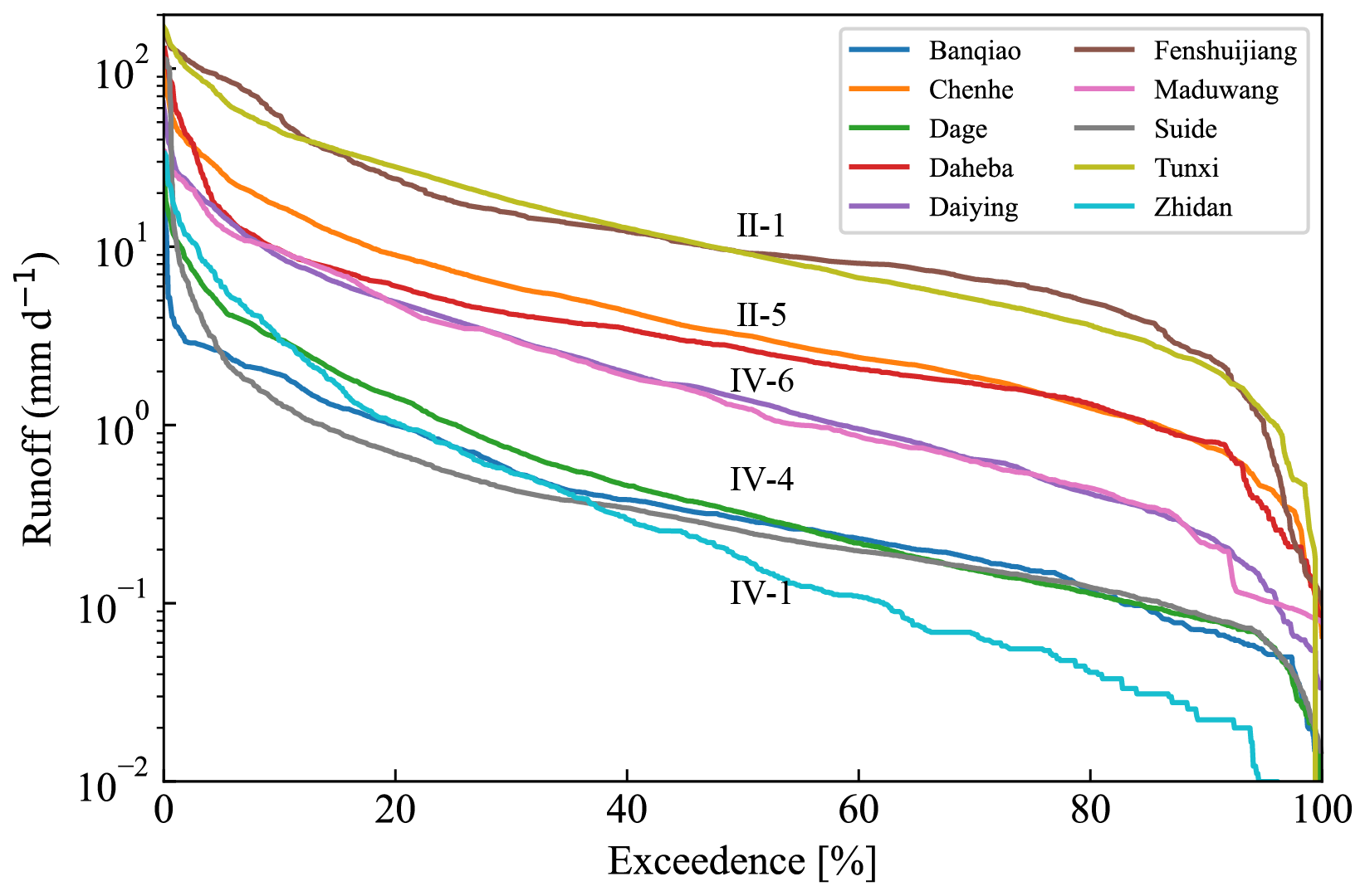 Event-scale flow-duration curves (FDCs) derived from hourly discharge during individual flood events reveal additional structure in runoff response that is closely related to the landscape classes (Fig. 9). The shapes of the event-based FDCs allow the ten catchments to be grouped into five hydrologically homogeneous response types: (1) Tunxi and Fenshuijiang, (2) Chenhe and Daheba, (3) Daiying and Maduwang, (4) Dage, Suide and Banqiao, and (5) Zhidan. Tunxi and Fenshuijiang (class II-1) are low-elevation, fine-soil, densely vegetated basins in a humid monsoon climate. Their FDCs are relatively flat, with high discharges sustained over a wide range of exceedance probabilities and gentle lower tails, indicating buffered event responses with substantial groundwater and subsurface contributions. Chenhe and Daheba (class II-5) drain steeper terrain at higher elevations; their FDCs show high event flows that are only slightly lower than those of class II-1 but still relatively gradual recessions, suggesting strong, but not excessively flashy, storm responses underlain by considerable storage. Zhidan (class IV-1), by contrast, represents a highly dissected, coarse-soil upland basin with low precipitation in climate region IV. Its FDC lies well below those of the other catchments over most of the exceedance range and is much steeper, with event flows dropping rapidly from moderate peaks to very low discharges. This pattern indicates the dominance of fast surface-runoff pathways, limited event water storage and a weak baseflow component. The remaining catchments occupy intermediate positions between these end-members, with FDC shapes that reflect progressive changes in relief, soil texture, and drainage density.