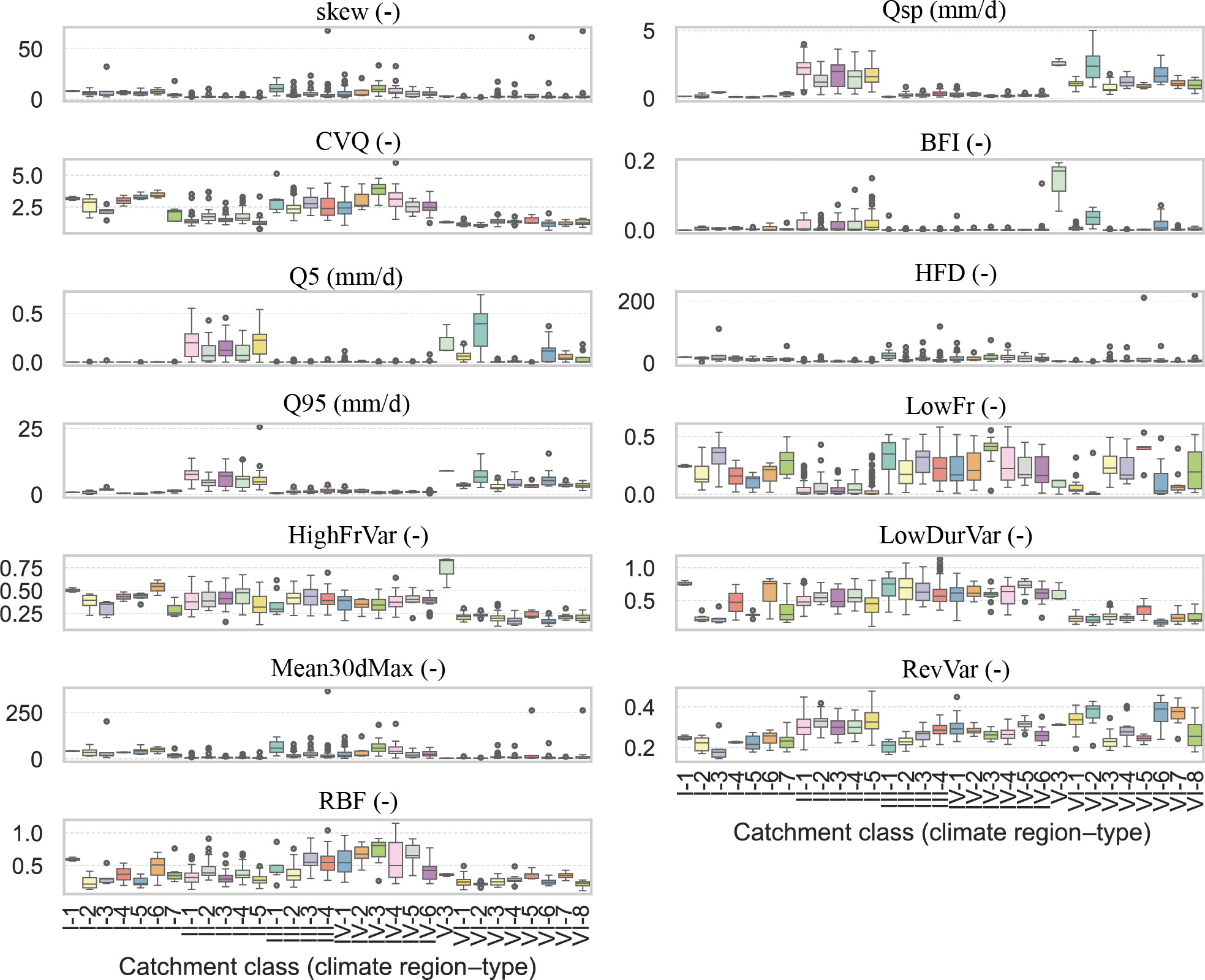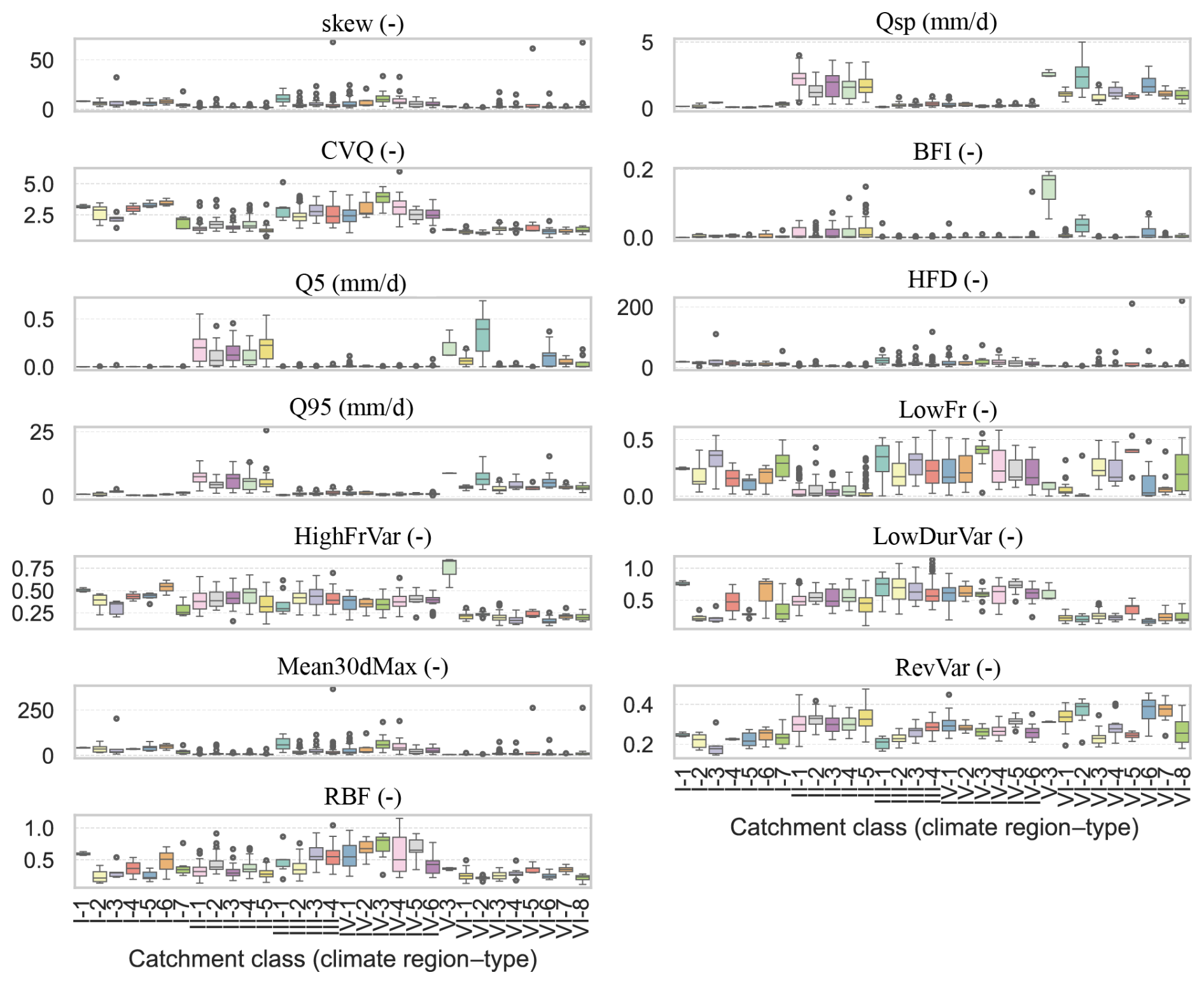 The spatial organisation of climate and landscape has long been recognised as a primary control on catchment hydrological response. Climate directly affects runoff generation at the event scale and indirectly shapes the hydrological cycle through its influence on long-term soil moisture storage and the co-evolution of landscape and vegetation (Jehn et al., 2020). Previous large-sample studies have shown that a small set of climate indices can effectively summarise these controls. Betterle et al. (2019) identified five indices that are particularly relevant for hydrological processes: annual average aridity, seasonality of aridity, fraction of precipitation falling as snow, average rainfall intensity, and seasonality of rainfall intensity. Although precipitation intensity varies substantially across regions, its hydrological effects are strongly conditioned by local catchment characteristics. We therefore do not include rainfall-intensity-based indices in this study and adopt three indices (Im, Im,r and fs) from this framework, while examining the role of landscape characteristics in modulating hydrological response in later sections.