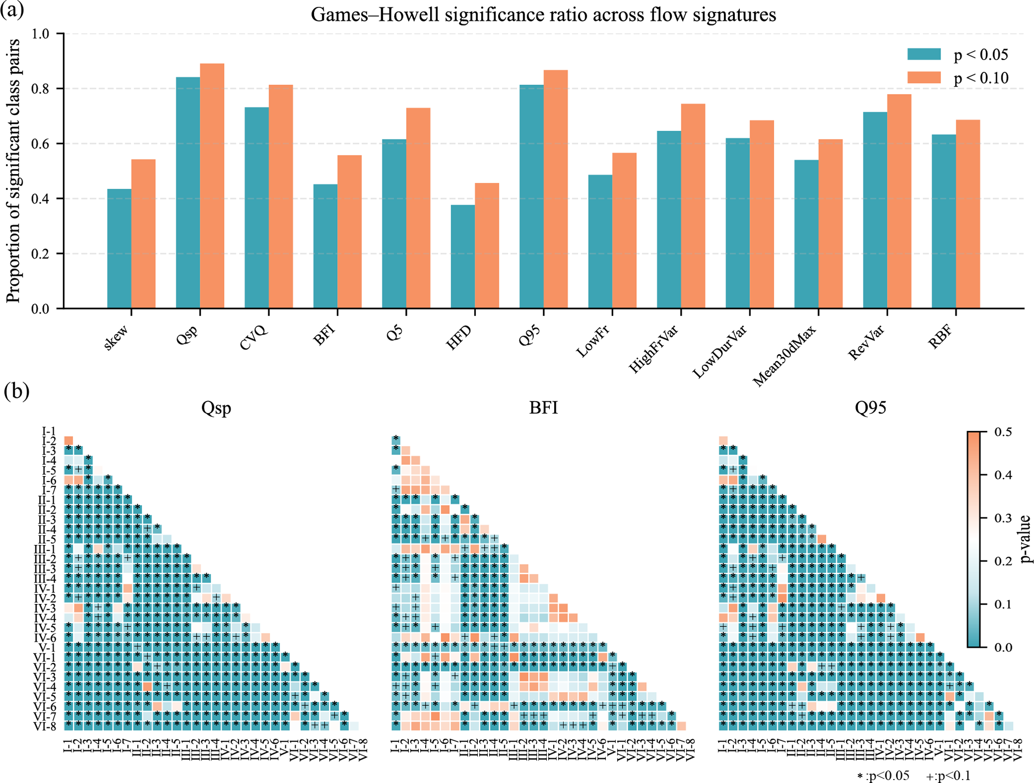 Figure 12Validation of catchment classification using hydrological flow signatures. (a) Proportion of significantly different class pairs (p<0.05 and p<0.10) for 13 flow signatures based on the Games-Howell test. (b) Pairwise Games-Howell p-value matrices for selected flow signatures (Qsp, BFI, and Q95), showing the degree of hydrological distinctiveness among catchment classes.