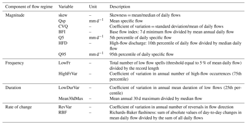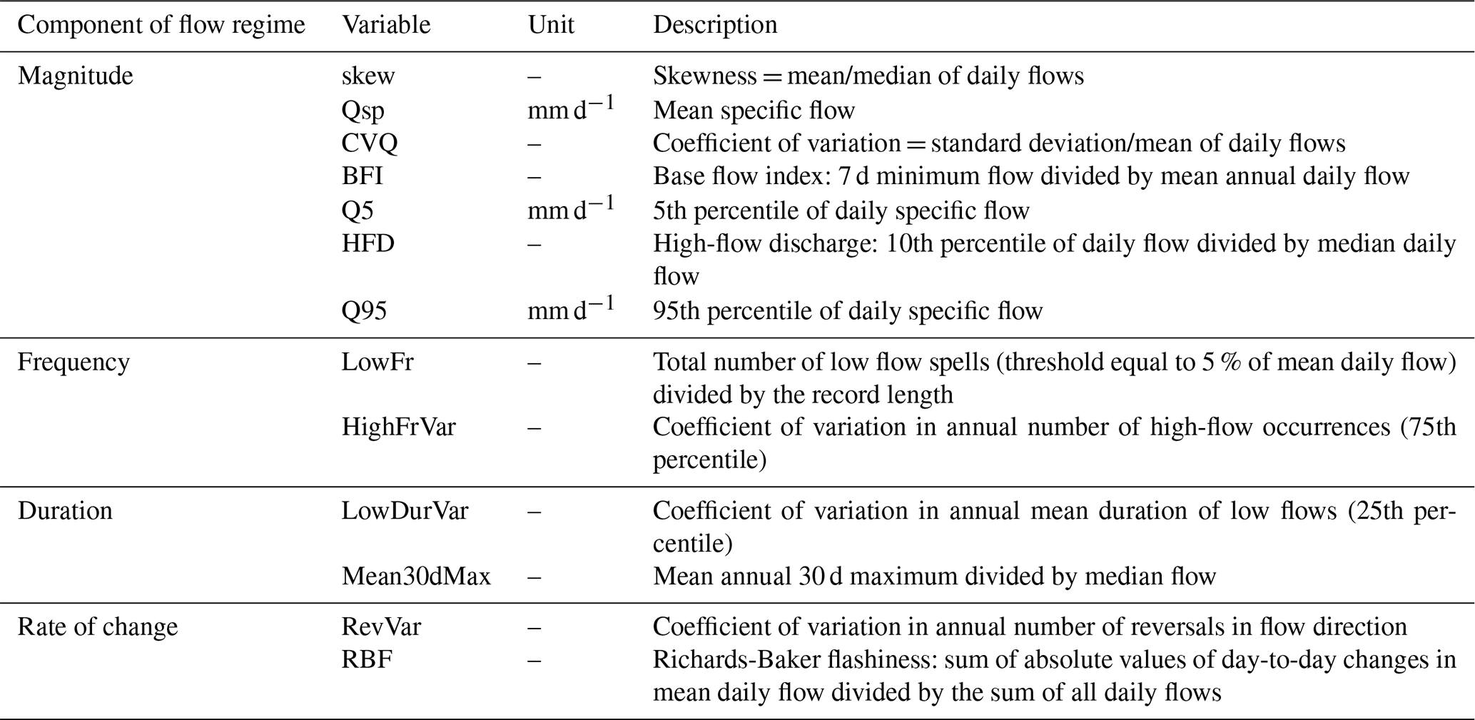 To extend the analysis beyond this small set of gauged basins, a large-sample statistical assessment was conducted using flow signatures (FS) derived from daily discharge time series. We adopted 13 FS following Kuentz et al. (2017) and Xu et al. (2024). These signatures (Table 2) summarise key aspects of hydrological behaviour, including flow magnitude, the frequency and duration of high and low flows, and the rate of change in discharge. The FS were computed from daily discharge records for all basins with sufficiently long and consistent time series.