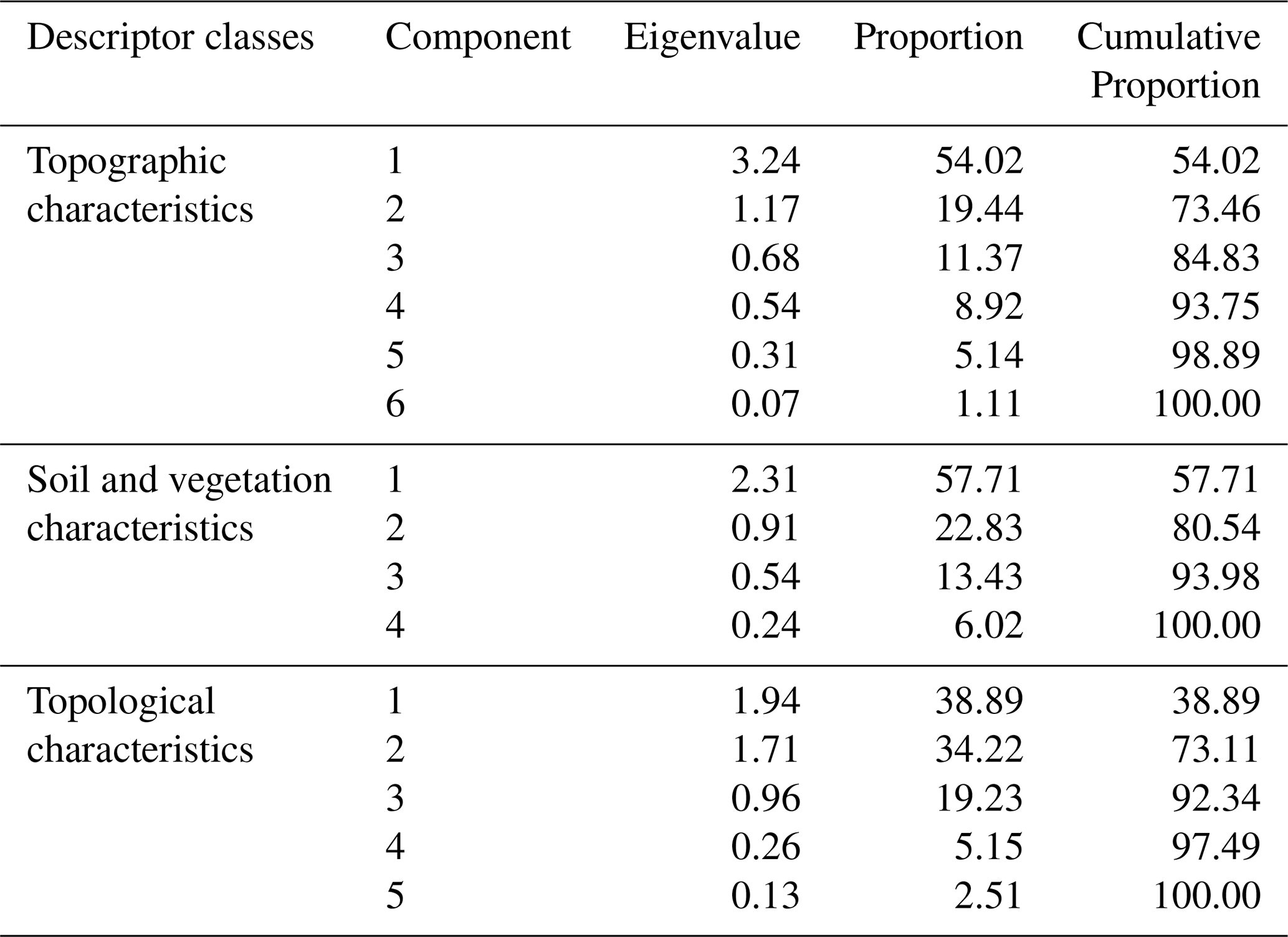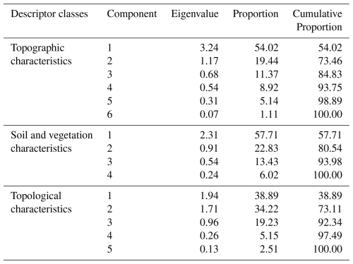 Building on the climatic partitioning, catchments are subsequently classified within each climate region using their landscape characteristics. Each of the 13 487 catchments is associated with a climate region via the dominant climate type at its outlet grid cell. Within each region, the fifteen catchment descriptors defined in Sect. 2.2.2 are used to describe geomorphological and drainage-network controls. To obtain a compact and non-redundant feature space, pairwise rank correlations are examined and principal component analysis (PCA) is applied separately to the three descriptor groups (topographic, soil and vegetation, and drainage-network characteristics). Principal components are retained until the cumulative explained variance stabilises, and the retained component scores are used as clustering variables.