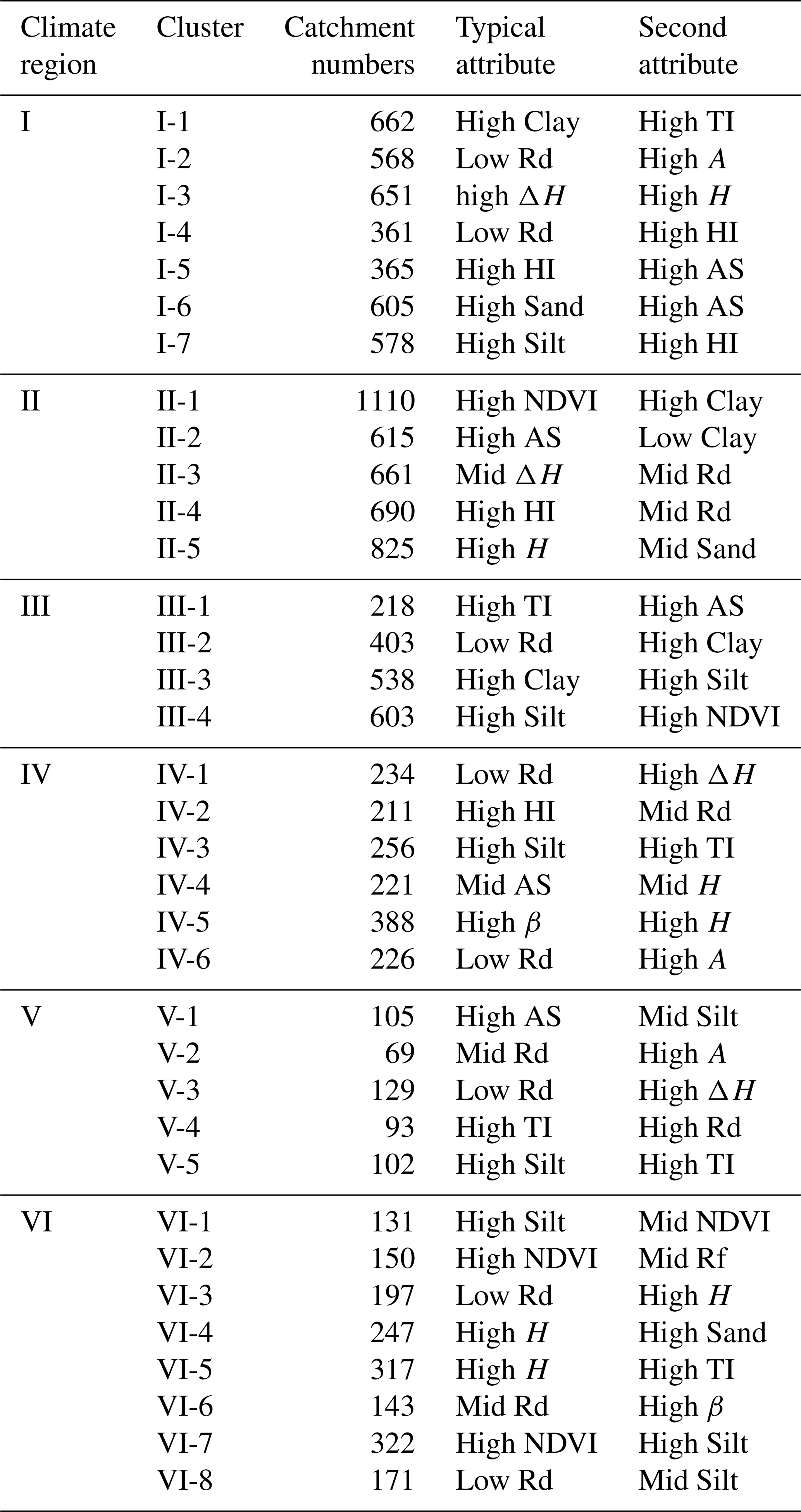 Within the six climate regions, the SOM-FCM procedure partitions the 13 487 catchments into 35 landscape-based clusters, with 7, 5, 6, 6, 5 and 8 clusters in Regions I–VI, respectively. Each catchment has fuzzy membership values to all clusters; for subsequent analyses, catchments with a maximum membership ≥ 0.5 are treated as clearly assigned to a dominant type (Schwämmle and Jensen, 2010), whereas lower maximum memberships indicate transitional behaviour between clusters. The proportion of clearly assigned catchments differs among climate regions (e.g. a relatively large share of transitional basins in Region VI versus predominantly well-defined types in Region V), reflecting contrasts in landscape complexity. Typical attributes and spatial distribution patterns of all clusters are summarized in Table 4 and Fig. 7, with additional descriptor boxplots in Fig. S3.
