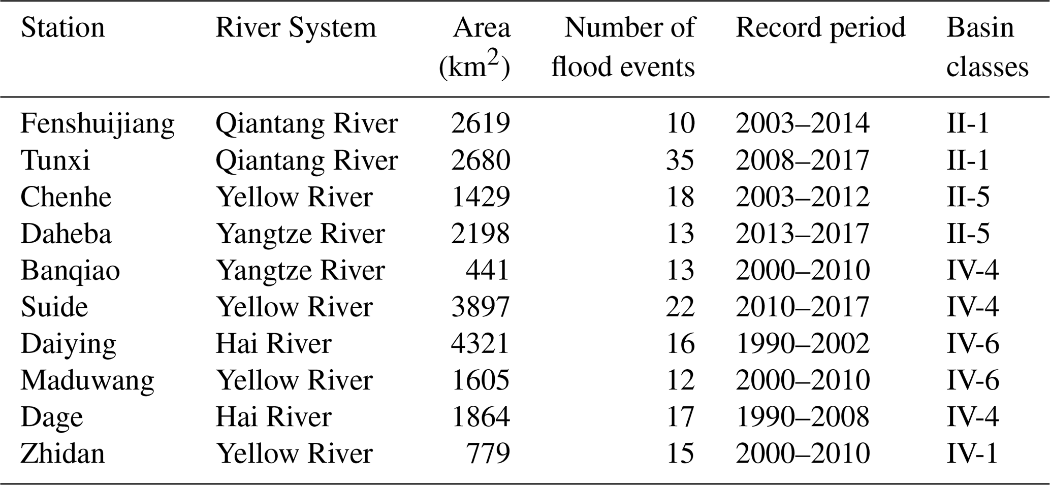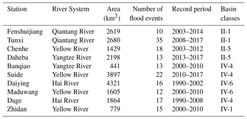 Because discharge observations with consistent coverage across China are limited, we evaluated the hydrological validity of the classification using both gauge records and a global discharge reanalysis product. Daily runoff data for ten gauged catchments were collected from national hydrological yearbooks and used for process-oriented evaluation. These catchments were selected primarily based on data availability and quality, with the additional aim of spanning multiple climate regions and class memberships. The selected catchments satisfied three criteria: (i) 10–15 years of continuous daily rainfall and runoff records with 10–35 documented flood events, (ii) no major upstream regulation or abstractions, and (iii) coverage of multiple climate regions and catchment classes as permitted by data availability (Li et al., 2018). In addition, flow signatures were derived from the Global Reach Level Flood Reanalysis (GRFR) dataset (Yang et al., 2021b), which provides 3 hourly discharge time series for river reaches worldwide from 1980–2019 and has been evaluated against daily discharge records from more than 14 000 gauging stations. HydroBASINS catchments were matched to GRFR river reaches based on upstream drainage area. Headwater basins with a relative area mismatch below 10 % and without documented upstream modifications were retained, yielding 722 representative basins for large sample validation based on flow signatures.