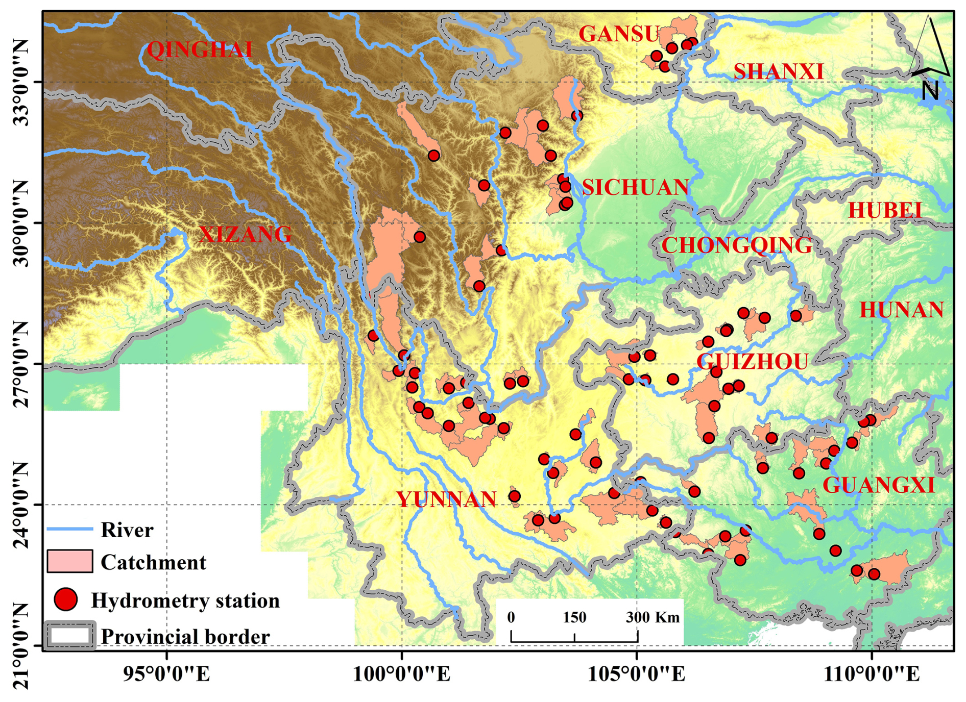 This study investigated 80 mountainous catchments in Southwestern China, encompassing Sichuan, Yunnan, Guangxi, Guizhou, and Chongqing provinces (Fig. 1). This region exhibits diverse climatic zones, including subtropical monsoon, plateau mountain, and tropical monsoon climates. The selected catchments have an average area of 1586 km2 (ranging from 109 to 6564 km2), with elevations ranging from 63 to 6284 m. Mean annual temperature varies from 15 to 20 °C, and annual precipitation ranges from 1200 to 1800 mm (Li et al., 2016), with approximately 80 % of the annual precipitation occurring during summer and autumn, contributing to frequent flooding events (Cheng et al., 2019). These catchments are situated within a heavily forested region, the second largest in China (Hua et al., 2018), with forest cover ranging from 3 % to 92 % (mean: 51 %), influencing evapotranspiration and runoff generation. Dominant soil types, according to the Genetic Soil Classification of China (Shi et al., 2004), include purple soil (12.20 %), yellow soil (11.39 %), and red soil (9.52 %), each with distinct hydrological properties.