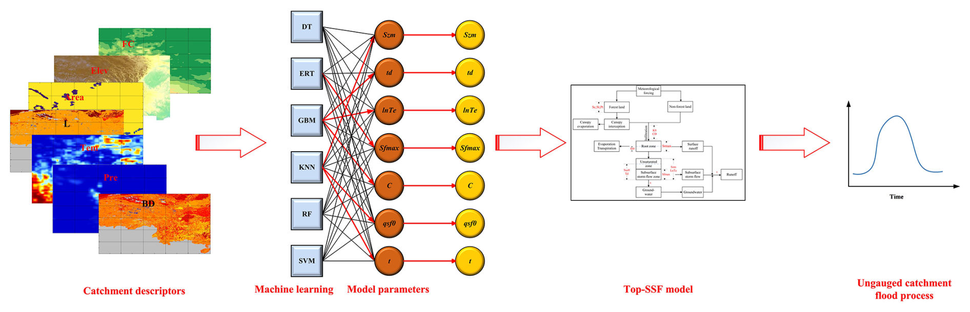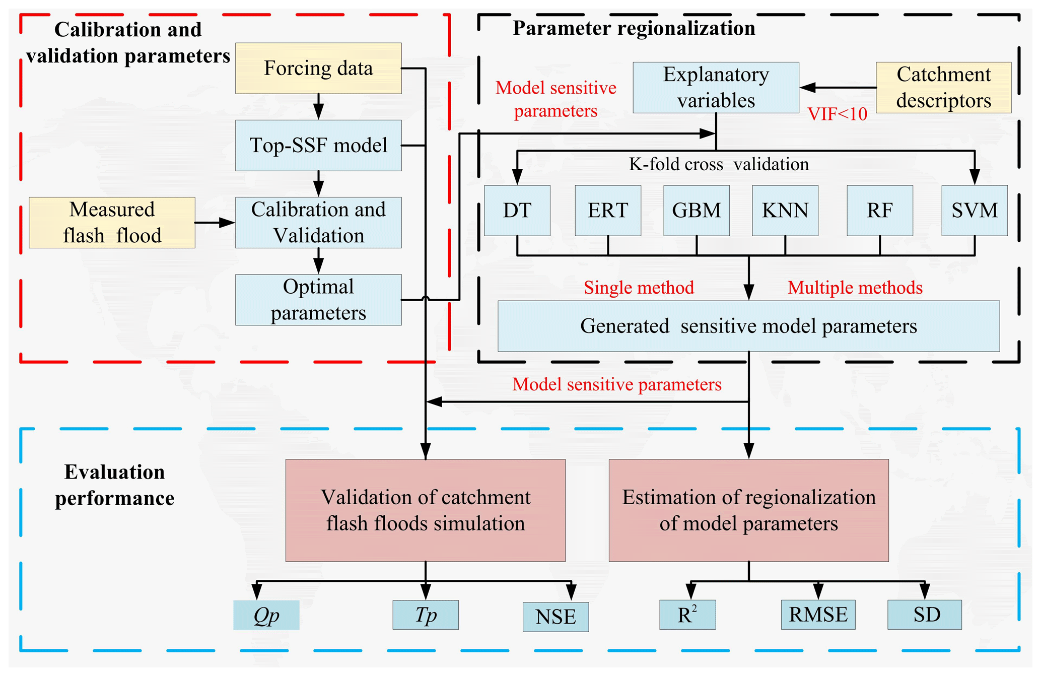 Figure 4Flowchart illustrating the parameter calibration, validation, and regionalization workflow. Abbreviations: Top-SSF (Topography-Based Subsurface Storm Flow hydrological model), DT (Decision Tree), ERT (Extremely Randomized Trees), GBM (Gradient Boosting Machine), KNN (K-Nearest Neighbor), RF (Random Forest), SVM (Support Vector Machine), NSE (Nash-Sutcliffe efficiency), R2 (Coefficient of Determination), Qp (The relative error of flood peak flow), Tp (The absolute error in flood peak occurrence time), VIF (Variance inflation factor), RMSE (Root mean square error), SD (Standard deviation).