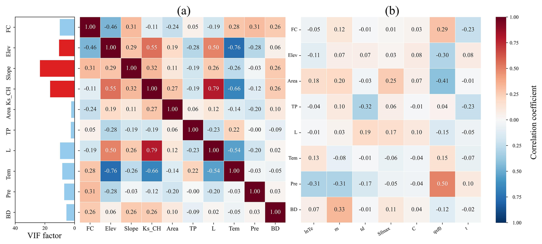 To mitigate the effects of multicollinearity on the accuracy and reliability of the parameter regionalization methods, catchment descriptors were screened using the variance inflation factor (VIF) and correlation coefficients. A VIF threshold of less than 10 (VIF < 10) was used to indicate acceptably low multicollinearity (Salmeron et al., 2018). Initial screening identified strong correlations between several descriptor pairs, notably L with Ks_CH, and Tem with Elev. Furthermore, the VIF values for Ks_CH and Slope were found to exceed 10. Consequently, Ks_CH and Slope were removed from the potential set of descriptors. Following their removal, a re-evaluation of the VIF for the remaining descriptors was conducted. Although a notable correlation exists between Tem and elevation (Elev), their VIF values in the reduced set were both below the threshold of 10. Given the importance of Tem for representing climate impacts and Elev as a key topographic driver, both were retained to preserve potentially valuable information. The final set of seven catchment descriptors selected for regionalization therefore comprised FC, Elev, Area, L, Tem, Pre, and BD. As illustrated in Fig. 3b, the correlations among these final descriptors and the sensitive model parameters are generally low (highest at 0.5), suggesting that the relationships are complex and nonlinear.