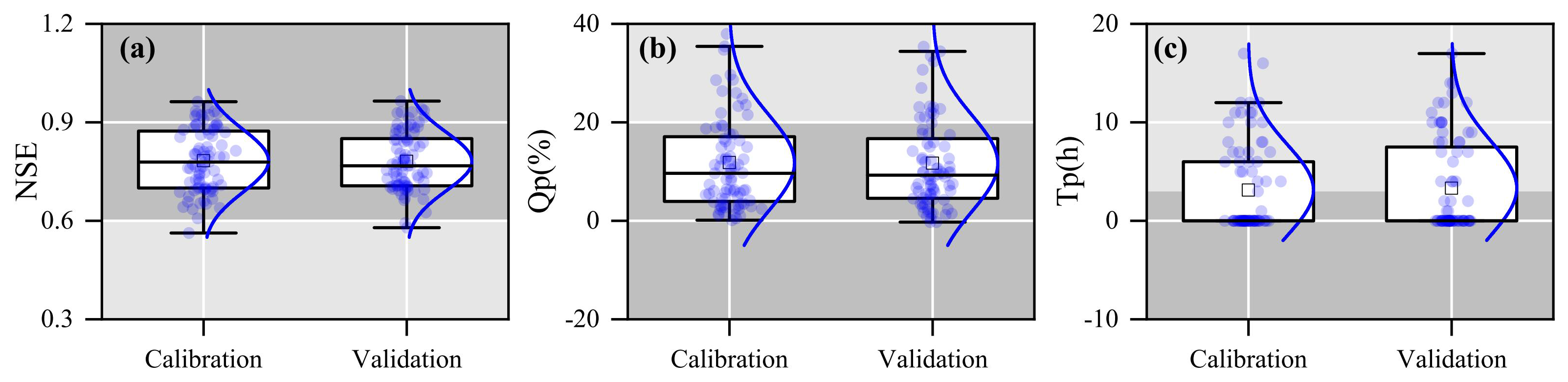 Figure 5Boxplots of (a) NSE, (b) Qp, and (c) Tp during the calibration and validation periods for 80 gauged catchments. The box represents the interquartile range, with the middle line indicating the median (50th percentile). The whiskers represent the minimum and maximum values. “□” represents the mean value. Dark grey indicates the range of flood prediction criteria (i.e., NSE > 0.75, Qp < 20 %, and Tp < 2 h).