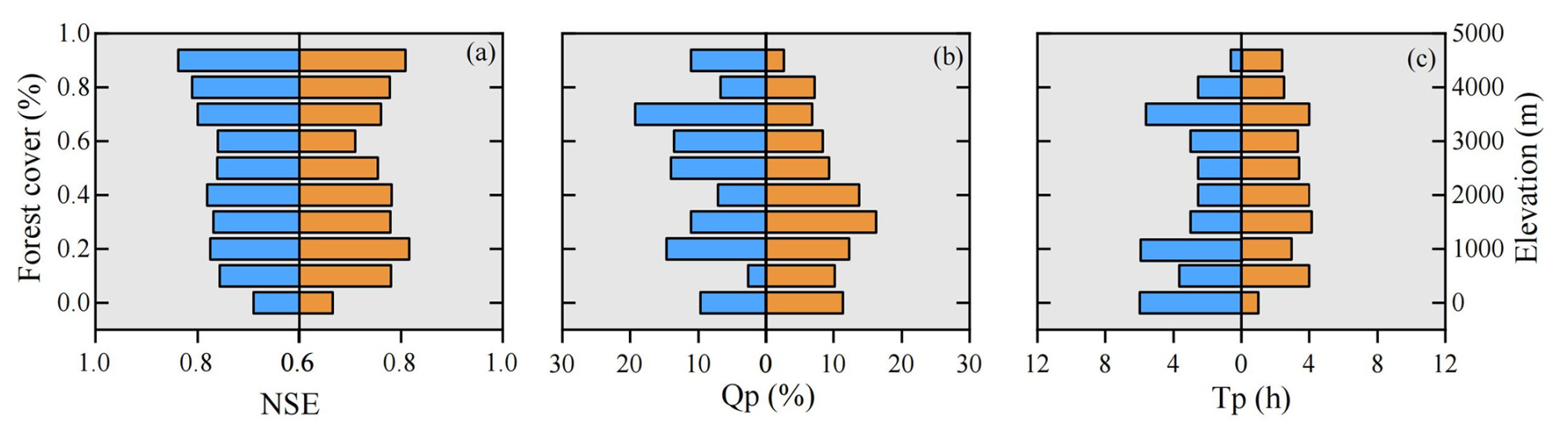 Model performance also exhibited some dependence on catchment characteristics. For instance, NSE generally improved with increasing forest cover (Fig. 6a), potentially due to the model's explicit representation of forest canopy interception and subsurface storm flow generation mechanisms. The relationship between NSE, Qp, Tp and elevation was more complex, suggesting a nonlinear influence of elevation on model performance (Fig. 6a–c). The demonstrated robust performance of the Top-SSF model provides a strong foundation for its application in subsequent parameter regionalization analyses.