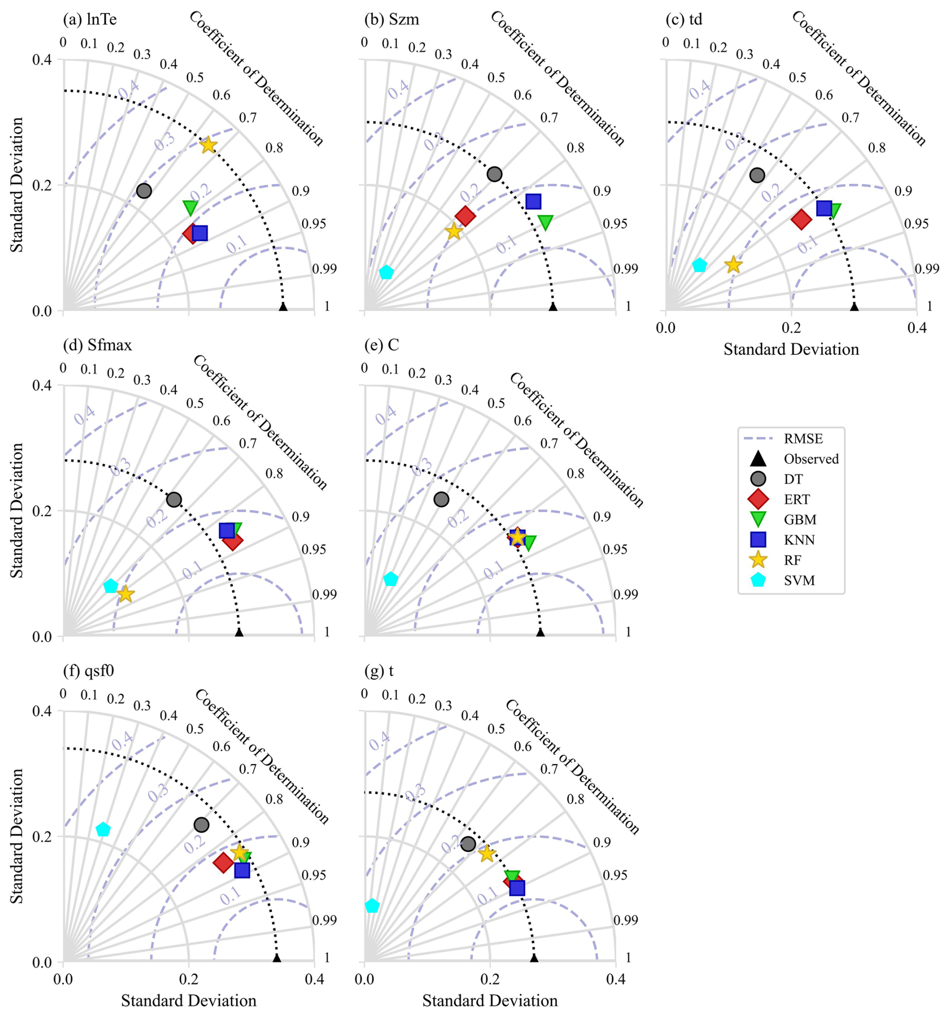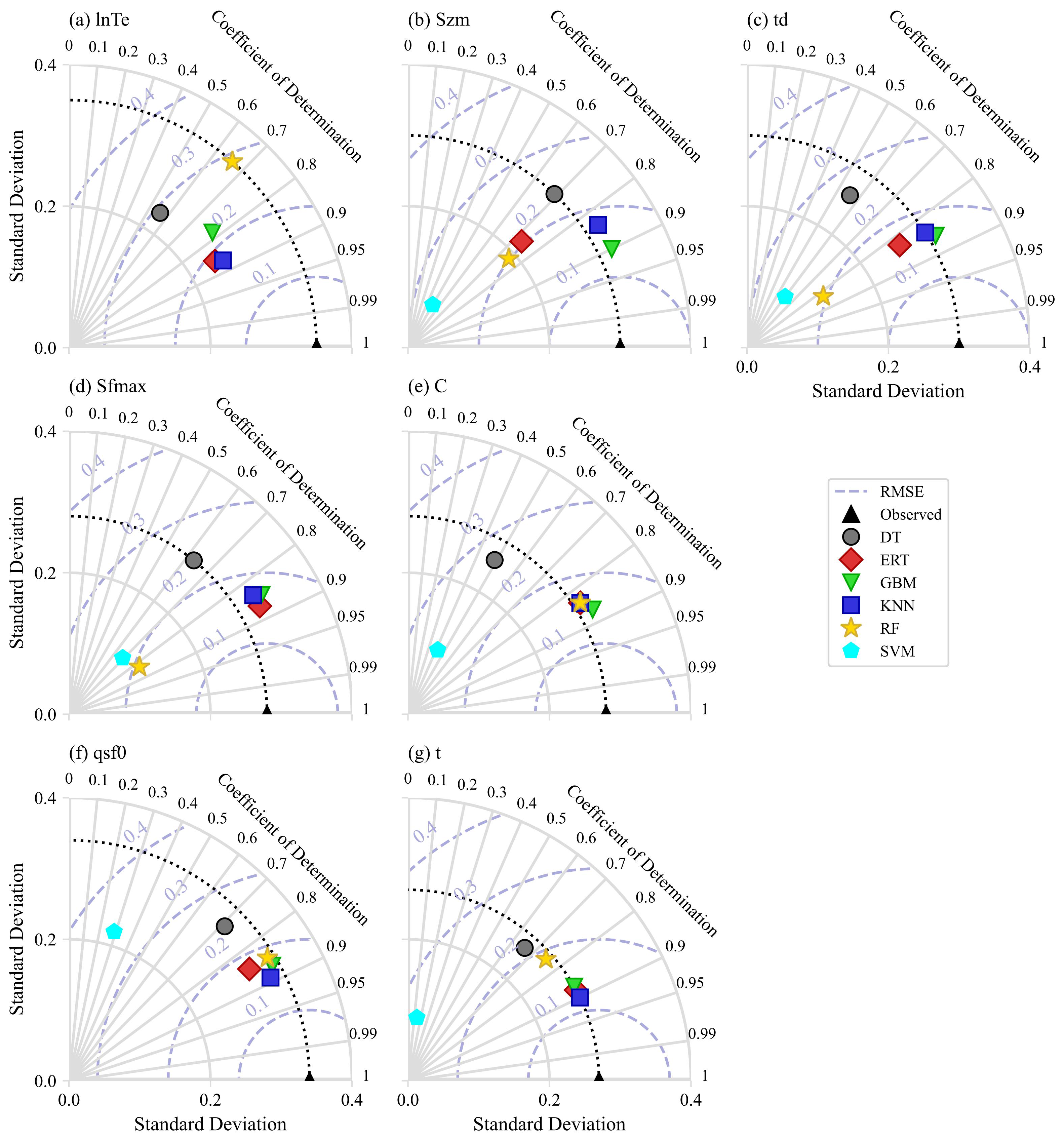 Figure 7Performance of parameter regionalization methods assessed using Taylor diagrams. The diagrams show the accuracy of sensitive model parameter estimates, with the coefficient of determination (R2) indicated by the radial axis, standard deviation (SD) by the horizontal and vertical axes, root mean square error (RMSE) by the grey-blue dotted lines, and the standard deviation of observations by the black dotted line.