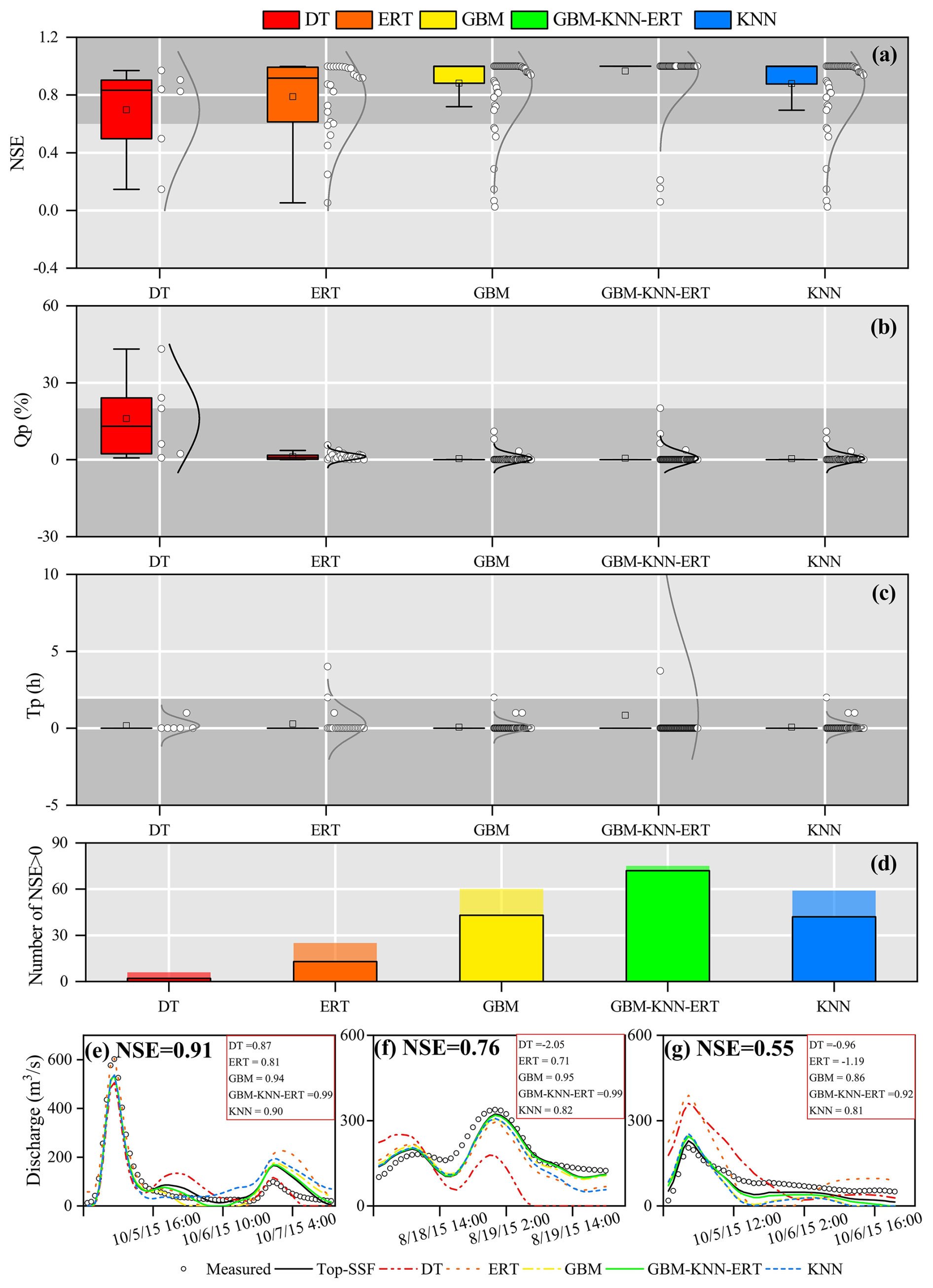 The hydrographs show how the GBM-KNN-ERT ensemble achieves superior performance by leveraging the complementary strengths of its component methods. For instance, in the high-performance case (Fig. 8e), the GBM and KNN methods capture the overall shape well, but the ERT simulation provides a more precise estimation of the primary flood peak. The final ensemble successfully integrates this peak accuracy, resulting in the highest overall performance. Similarly, Fig. 8f shows that the ensemble moderates the slow initial rise characteristic of the KNN method, leading to a more realistic rising limb. The ensemble method ability to balance competing errors is most evident in the low-performance case (Fig. 8g). During the recession phase, the ensemble method averages the high bias of the ERT method with the low bias of the GBM and KNN methods, producing a hydrograph that more closely resembles the benchmark simulation than any single model could. This synergy demonstrates that the ensemble method superior performance is a direct result of its ability to integrate the specific, complementary strengths of each member model across different parts of the hydrological process.