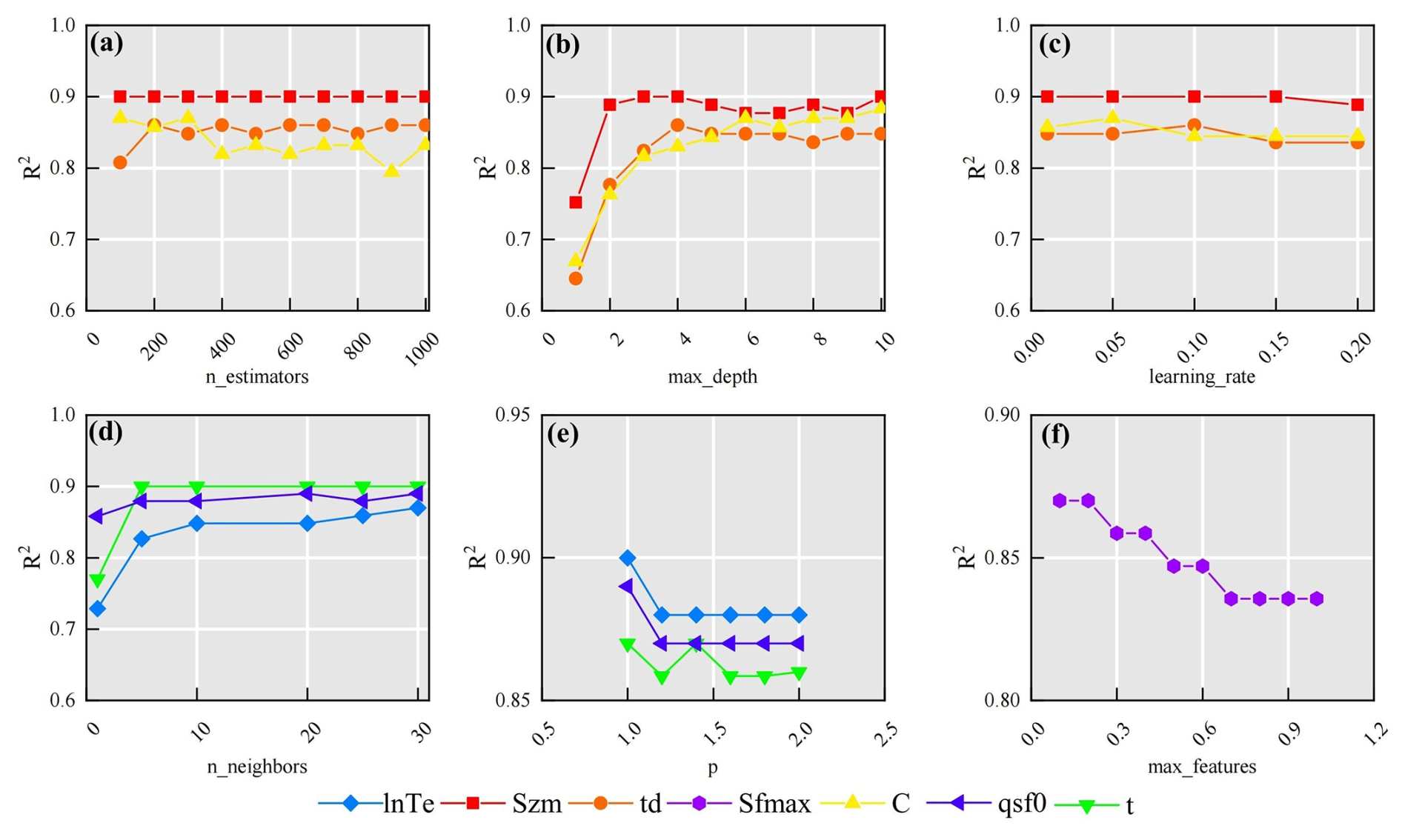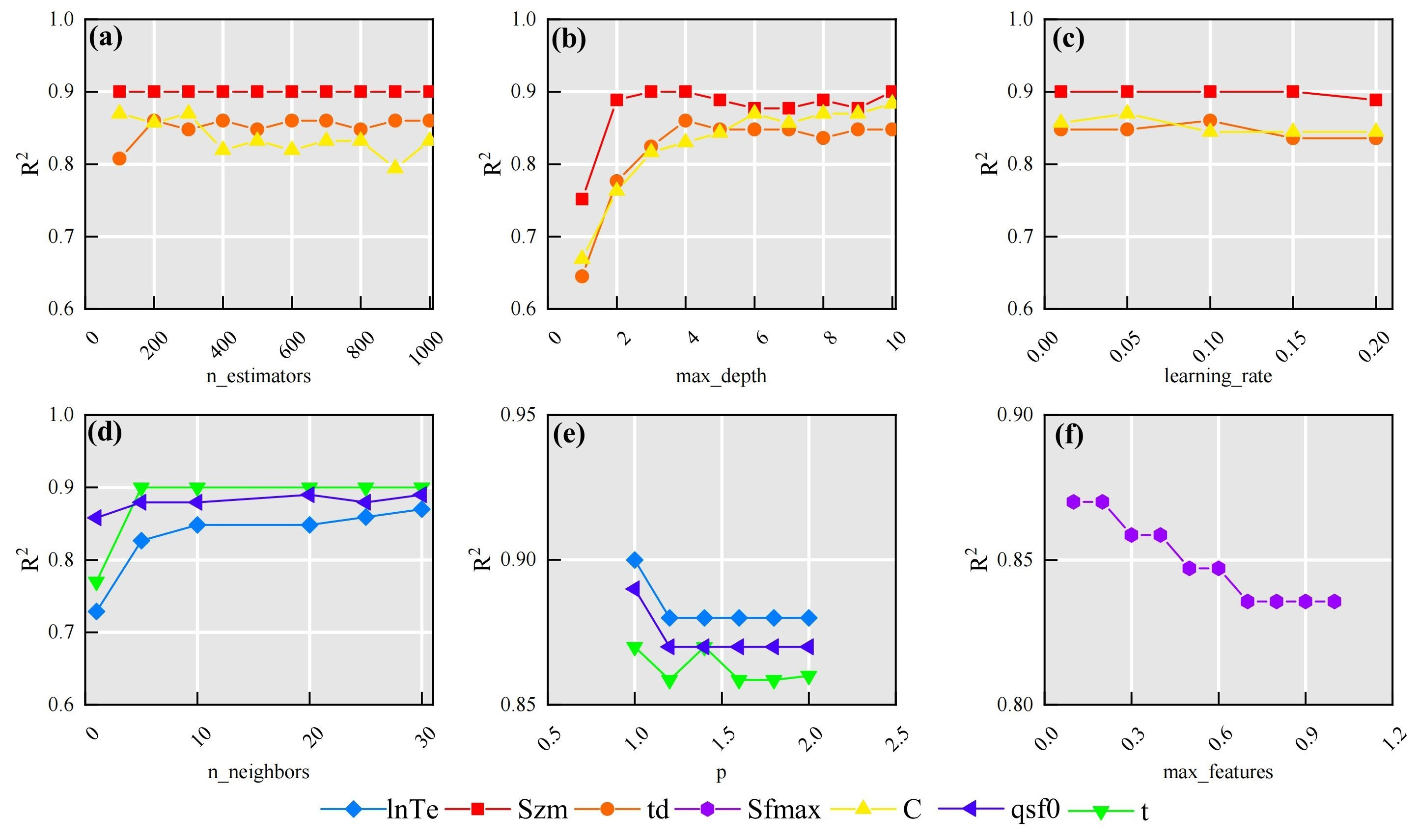 Figure 9Sensitivity of parameter estimation performance to key hyperparameters in (a–c) GBM, (d–e) KNN method, and (f) ERT. (a) n_estimators (number of decision trees in GBM), (b) max_depth (maximum depth of decision trees in GBM), (c) learning rate (GBM), (d) n_neighbors (number of neighbors in KNN), (e) p-value of Minkowski distance (KNN; p=1: Manhattan distance, p=2: Euclidean distance), and (f) max_features (ERT).