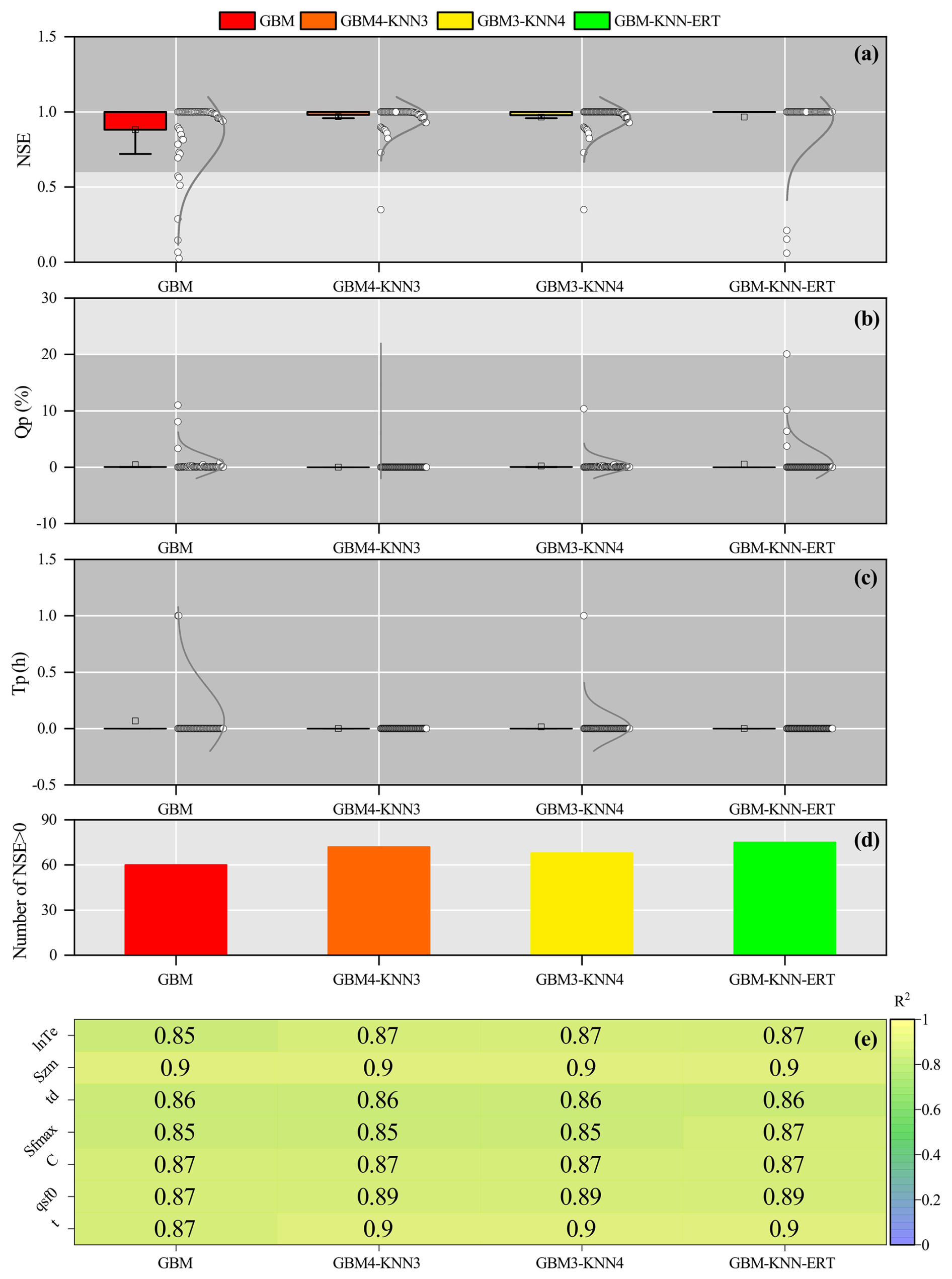 Figure 10Assessment of combined machine learning methods for improved parameter regionalization in ungauged mountainous catchments. Performance is evaluated against the GBM method, showing (a) NSE, (b) Qp, (c) Tp, (d) Number of catchments with NSE > 0, and (e) the difference in R2.