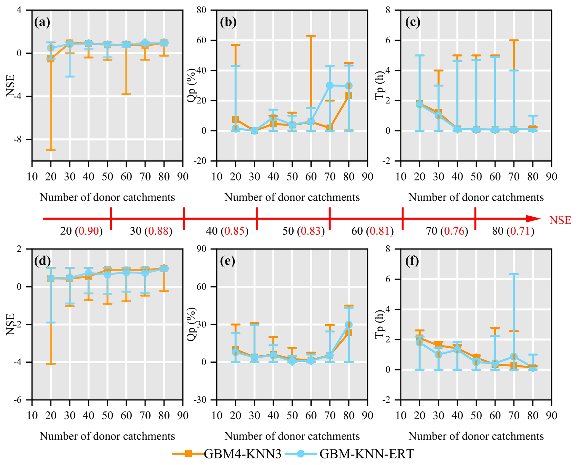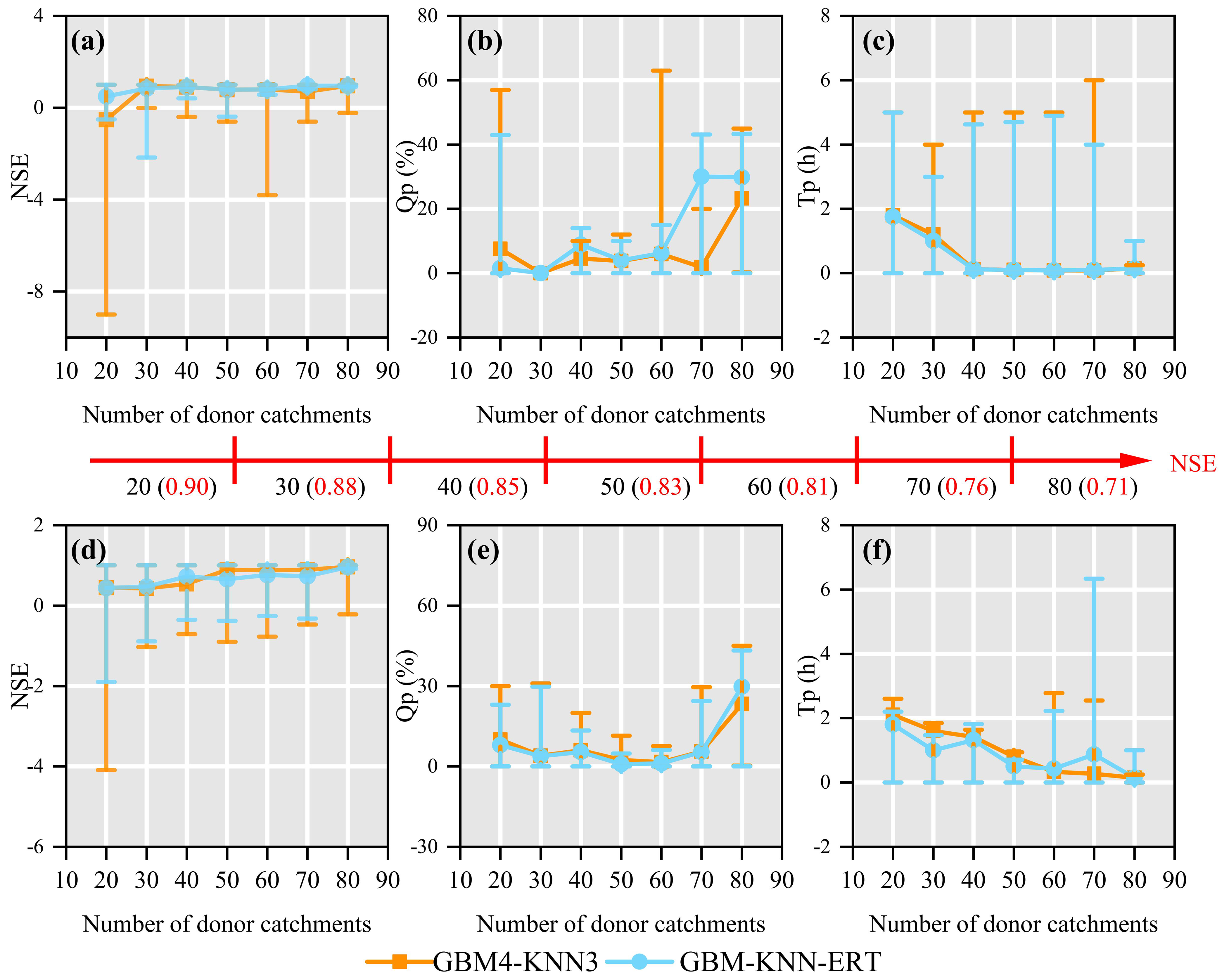 Figure 11Performance comparison of two donor catchment selection methods for parameter regionalization as a function of donor catchment quantity. Mode1 (a–c) selects donor catchments in order of decreasing NSE, while Mode 2 (d–f) selects them randomly. Flood prediction accuracy is assessed using NSE, Qp, and Tp. Error bars represent the full range (minimum to maximum) of the performance metrics.