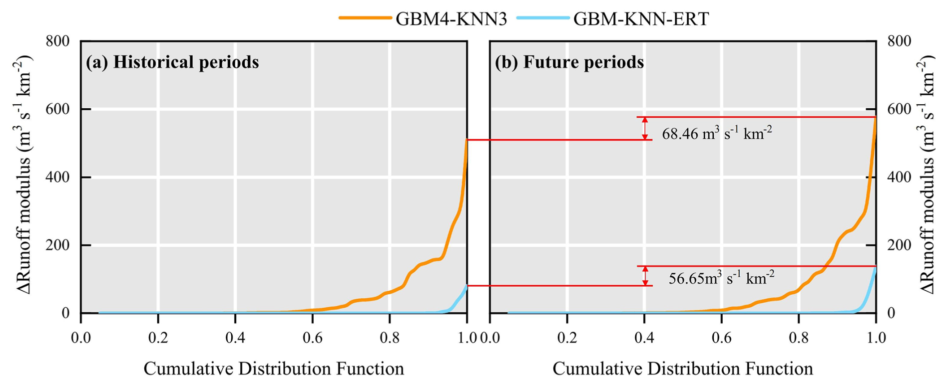 To quantitatively assess the impact of climate change, an experiment was devised where this impact was primarily reflected through changes in two key catchment descriptors: Tem and Pre. For the historical period, these descriptors represent the multi-year averages over 1901–2021, while for the future period, they represent the projected multi-year averages over 2022–2100 under the SSP5-8.5 scenario. The regionalization methods (GBM4-KNN3 and GBM-KNN-ERT), which were trained exclusively using historical data, were then applied under these future conditions. Crucially, the method structures and hyperparameters remained fixed, and no retraining was performed; only the historical Tem and Pre values were replaced with their future projections. This approach allows the response of the established historical relationships to new, out-of-sample climatic inputs to be tested. The simulated peak discharges for this analysis were derived from the same three flood events used in the calibration and validation of the Top-SSF model. This experimental design is critical as it isolates the impact of the changed model parameters from the compounding effect of a different future rainfall event. Consequently, any observed change in the simulated flood peak is attributable solely to the sensitivity of the regionalization method to the shift in climatic descriptors. Cumulative distribution functions (CDFs) were then employed to illustrate the discrepancies between the parameter regionalization simulations and the reference simulations (derived from calibrated model parameters) across the historical and projected future periods for the 80 catchments (Fig. 12).