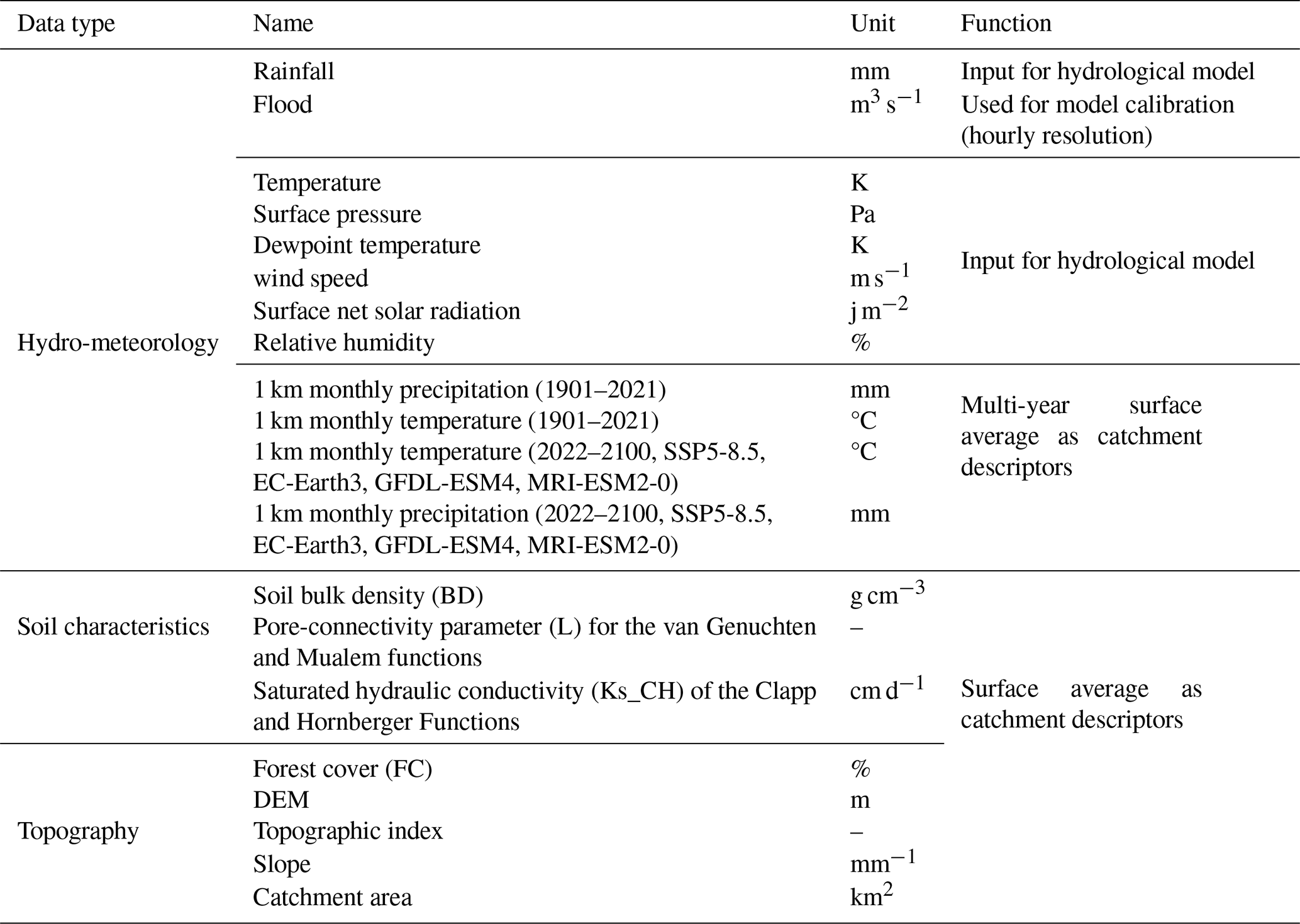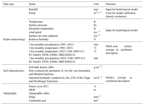 Hourly flow data (2015–2018) for 80 mountainous catchments in China were sourced from the Hydrological Bureau of the Ministry of Water Resources, through China's hydrologic yearbooks, encompassing a spectrum of events from flash floods and general floods which can be derived from mountainous upland catchments. Hourly rainfall data (2015–2018) were obtained from ground meteorological stations across China (http://en.weather.com.cn, last access: 8 July 2024), providing crucial input for hydrological modelling. Additional meteorological variables, including temperature, wind speed, dewpoint temperature, and surface net solar radiation, were obtained from the ERA5 hourly dataset (1940–present) (Hersbach et al., 2023), ensuring comprehensive atmospheric forcing. Relative humidity was estimated using dewpoint temperature. Historical (1901–2021) and projected future (SSP585, 2022–2100) temperature and precipitation data for China, averaged from the EC-Earth3, GFDL-ESM4, and MRI-ESM2-0 models at 1 km resolution, were obtained from ”A Big Earth Data Platform for Three Poles” to assess the impact of climate change (Ding and Peng, 2020) (http://poles.tpdc.ac.cn, last access: 15 July 2024). Topographic data, including a 30 m resolution Digital Elevation Model (DEM), used for river network and topographic index derivation, were obtained from EARTHDATA and used for river network delineation and topographic index derivation (https://search.earthdata.nasa.gov/search, last access: 18 July 2024). Forest cover data (30 m resolution) were sourced from the Global Forest Cover and Forest Change Map (https://www.noda.ac.cn/, last access: 18 July 2024), providing information on vegetation characteristics. Bulk density (BD) data were derived from the Soil Database of China for Land Surface Modelling (Dai et al., 2013). Soil hydraulic parameters, specifically saturated hydraulic conductivity (Ks_CH) for Clapp and Hornberger functions and the pore-connectivity parameter (L) for van Genuchten and Mualem functions, were acquired from the China Dataset of Soil Hydraulic Parameters Using Pedotransfer Functions for Land Surface Modeling (Shangguan et al., 2013).