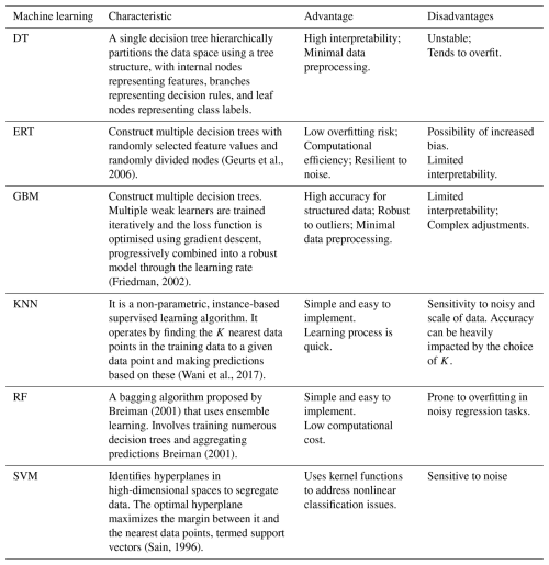 Recent advances in machine learning offer potential solutions by capturing nonlinear patterns in high-dimensional data. Such as Decision Tree (DT), Extremely Randomized Trees (ERT), Gradient Boosting Machine (GBM), K-Nearest Neighbor (KNN), Random Forest (RF), and Support Vector Machines (SVM) have shown promise in parameter regionalization (Golian et al., 2021; Song et al., 2022). However, existing machine learning-based parameter regionalization studies predominantly focus on runoff prediction at coarser temporal scales (daily or monthly) (Li et al., 2022; Wu et al., 2023), leaving a significant gap in high-resolution (hourly or sub-hourly) flood prediction in ungauged mountainous catchments. Moreover, these studies often rely on single machine learning methods to estimate all hydrological model parameters (Golian et al., 2021; Song et al., 2022; Wu et al., 2023). Given that different machine learning methods operate on distinct principles (Jordan and Mitchell, 2015; Zounemat-Kermani et al., 2021) and hydrological model parameters represent diverse hydrological processes (Li et al., 2024), a single machine learning method may not adequately capture the complexity of model parameter estimation (Golian et al., 2021; Wu et al., 2023). Therefore, exploring the multi-machine learning ensemble methods is essential to improve the accuracy of high-resolution flood prediction in ungauged mountainous catchments.
