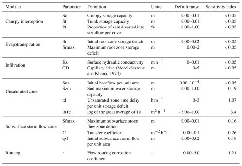 The sensitivity index (Si) of each hydrological model parameter was determined using the method of Lenhart et al. (2002), which assesses the influence of ± 10 % changes in parameter values (Eq. 1). Table 3 outlines the sensitivity analysis results for the model parameters across the 80 mountainous catchments. The Si values are categorized as follows (Guo et al., 2022): negligible sensitivity (), moderate sensitivity (), high sensitivity (), and extremely high sensitivity (). Based on the sensitivity analyses, seven sensitive model parameters were identified: Szm, lnTe, Sfmax, C, qsf, t (Table 3).