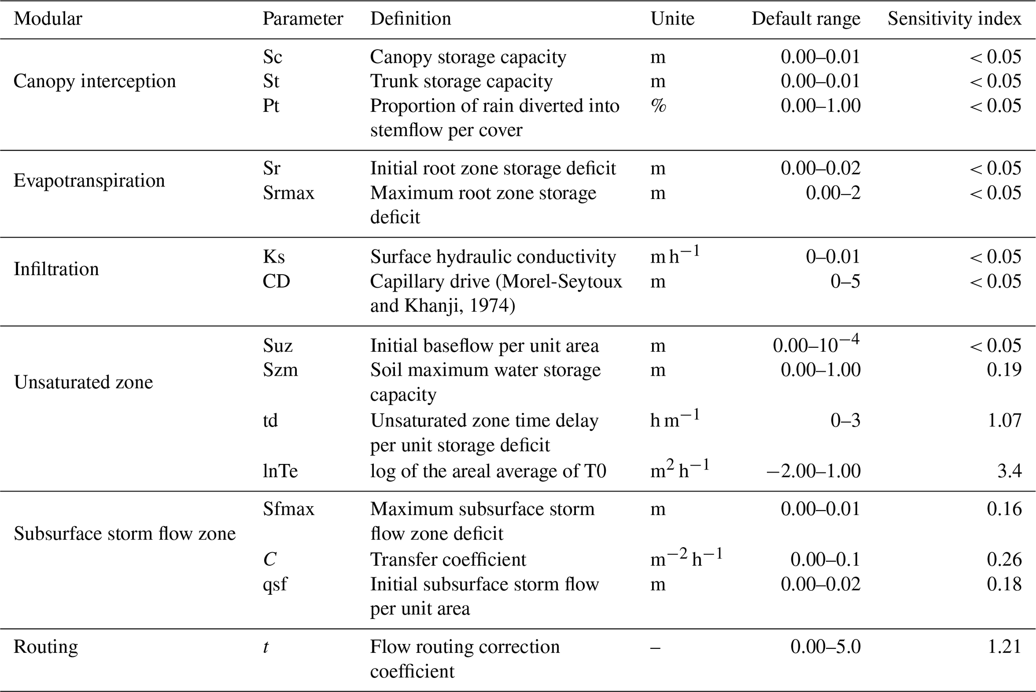 where, fin is the infiltration rate (m h−1); Ks is surface hydraulic conductivity (m h−1); CD is capillary drive (m); Fsatrt is the initial cumulative infiltration (m); Szm is the maximum water storage capacity in the unsaturated zone (m).