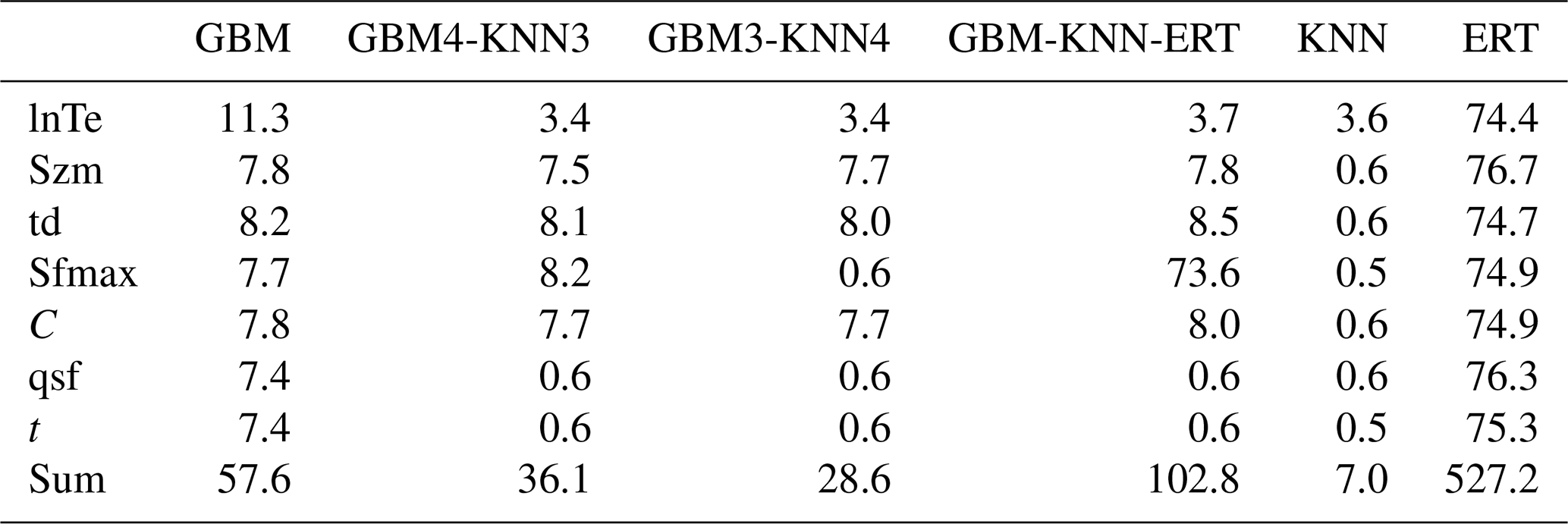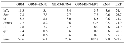Machine learning methods exhibit distinct strengths in hydrological parameter estimation due to fundamental differences in data processing mechanisms, pattern recognition strategies, and prediction generation (Bishop and Nasrabadi, 2006). This suggests that multi-machine learning ensemble methods have the potential to synergistically integrate advantages while effectively compensating for individual limitations, leading to more robust and accurate parameter estimates. As demonstrated in Fig. 10, the GBM-KNN-ERT method achieved notable improvements over any single machine learning method, particularly for sensitive parameters lnTe, Sfmax, qsf and t, with R2 increases ranging from 0.02 to 0.03 compared to the best-performing GBM method (Fig. 10e).