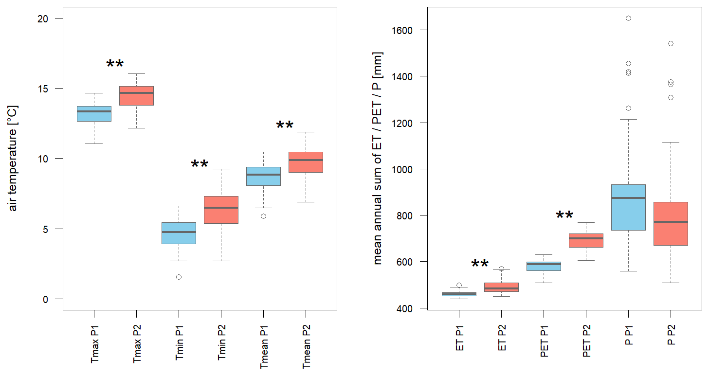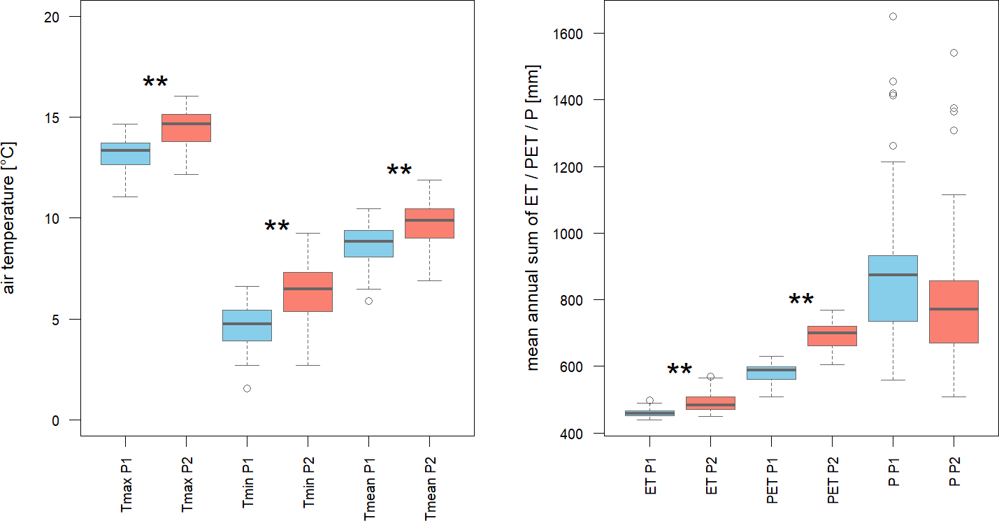Figure 2Changes in air temperature (left) and mean annual sums of evapotranspiration (ET), potential evapotranspiration (PET), and precipitation (P, mm; right) between period 1 (P1) and period 2 (P2). Tmax: maximum air temperature (°C), Tmin: minimum air temperature (°C), Tmean: mean annual air temperature (°C). Boxplots represent climatic data from 40 observed catchments. Data obtained from the German Weather Service (DWD, 2022).