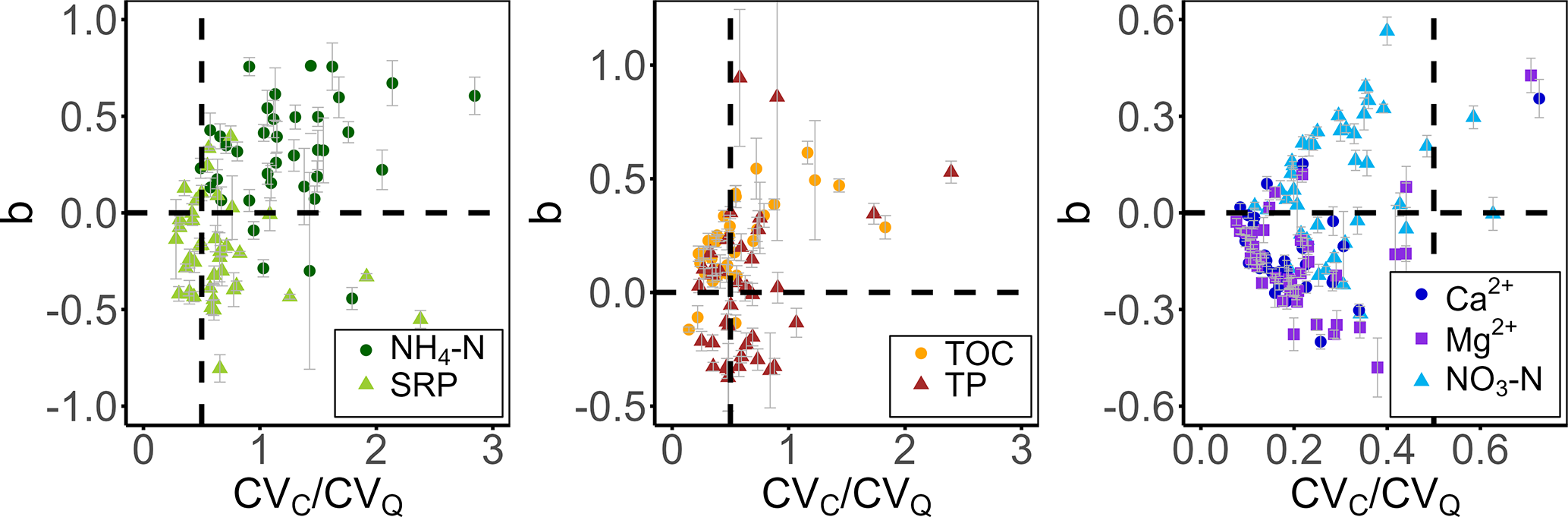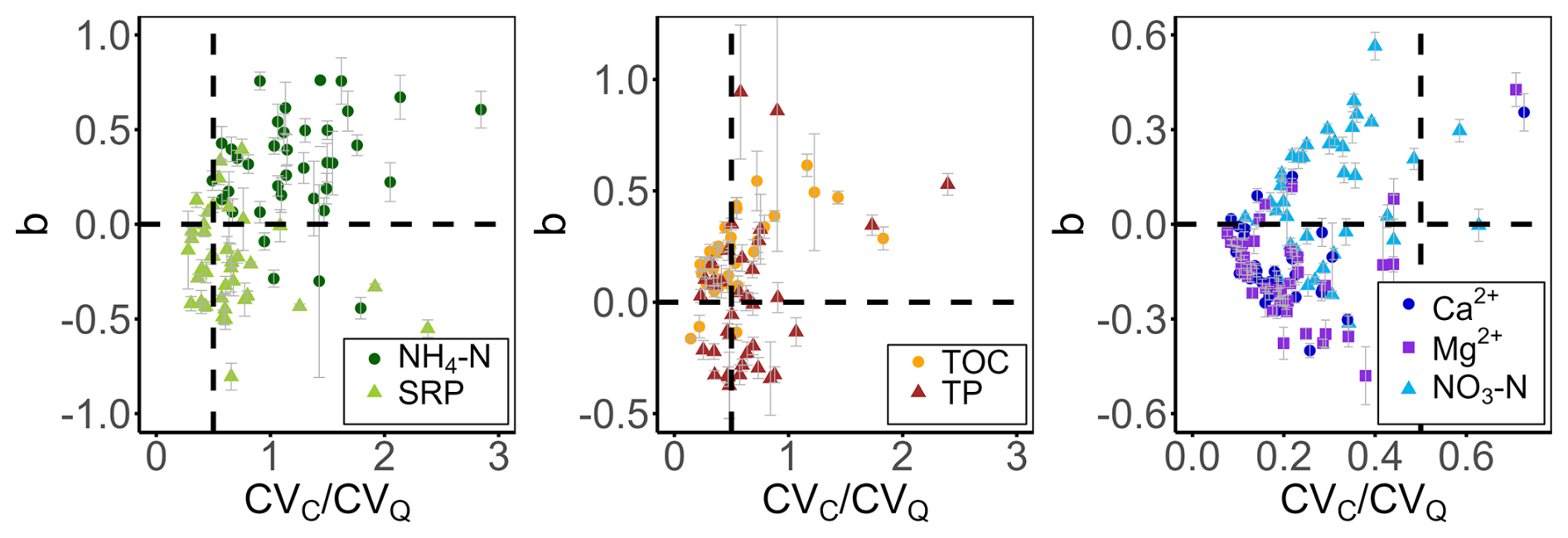 Figure 3Illustration of the SEM for ▴ SRP, • NH4-N, ▴ TP, • TOC, ▴ NO3-N, • Ca2+ and Mg2+ clusters, with error bars representing ±1 standard error. Clusters represent seasonal-dynamic solutes (green, left), long-term dynamic solutes (yellow/brown, middle), and long-term stable solutes (blue/violet, right). The vertical line separates chemostatic (left) from chemodynamic behaviour (right), while the horizontal line distinguishes enrichment (top) from dilution (bottom) patterns.
